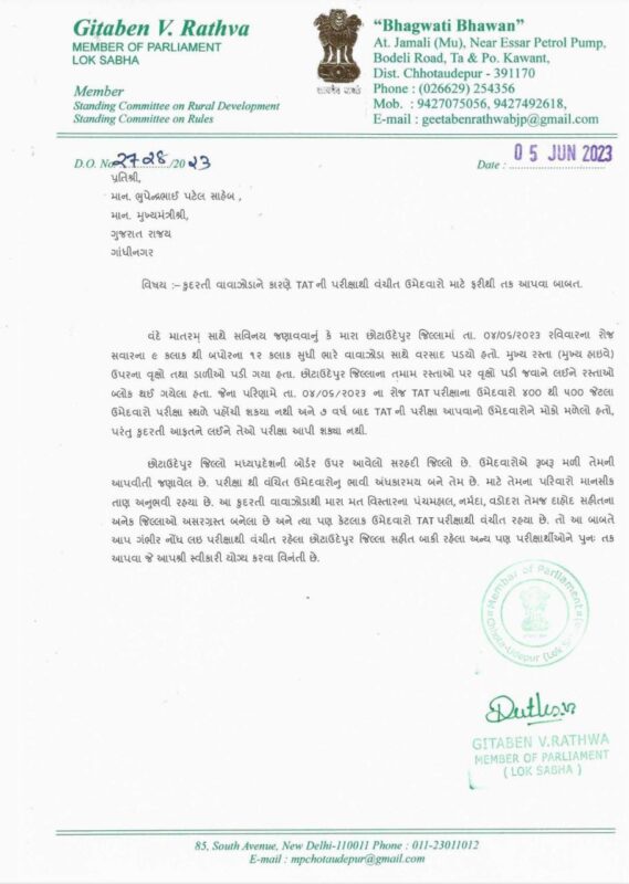 આ રજુઆતમાં તેમણે જણાવ્યું છે કે, છોટાઉદેપુર જિલ્લામાં તા. ૦૪/૦૬/૨૦૨૩ રવિવારના રોજ સવારના ૯ કલાકથી બપોરના ૧૨ કલાક સુધી ભારે વાવાઝોડા સાથે વરસાદ પડયો હતો. મુખ્ય રસ્તા (મુખ્ય હાઇવે) ઉપરના વૃક્ષો તથા ડાળીઓ પડી ગયા હતા. છોટાઉદેપુર જિલ્લાના તમામ રસ્તાઓ પર વૃક્ષો પડી જવાને લઈને રસ્તાઓ બ્લોક થઈ ગયેલા હતા. જેના પરિણામે તા. ૦૪/૦૬/૨૦૨૩ ના રોજ TAT પરીક્ષાના ઉમેદવારો ૪૦૦ થી ૫૦૦ જેટલા ઉમેદવારો પરીક્ષા સ્થળે પહોંચી શકયા નથી અને ૭ વર્ષ બાદ TAT ની પરીક્ષા આપવાનો ઉમેદવારોને મોકો મળેલો હતો, પરંતુ કુદરતી આફતને લઈને તેઓ પરીક્ષા આપી શક્યા નથી. છોટાઉદેપુર જિલ્લો મધ્યપ્રદેશની બોર્ડર ઉપર આવેલો સરહદી જિલ્લો છે. ઉમેદવારોએ રૂબરૂ મળી તેમની આપવીતી જણાવેલ છે. પરીક્ષાથી વંચિત ઉમેદવારોનુ ભાવી અંધકારમય બને તેમ છે. માટે તેમના પરિવારો માનસીક તાણ અનુભવી રહયા છે. આ કુદરતી વાવાઝોડાથી મારા મત વિસ્તારના પંચમહાલ, નર્મદા, વડોદરા તેમજ દાહોદ સહીતના અનેક જિલ્લાઓ અસરગ્રસ્ત બનેલા છે અને ત્યા પણ કેટલાક ઉમેદવારો TAT પરીક્ષાથી વંચીત રહયા છે. તો આ બાબતે આપ ગંભીર નોંધ લઇ પરીક્ષાથી વંચીત રહેલા છોટાઉદેપુર જિલ્લા સહીત બાકી રહેલા અન્ય પણ પરીક્ષાર્થીઓને પુનઃ તક આપવા જે આપશ્રી સ્વીકારી યોગ્ય કરવા વિનંતી છે. આમ સાંસદ ગીતાબેન રાઠવા પરીક્ષાર્થીઓના એક તક મળવી જોઈએ તેવી લેખિત રજૂઆત કરી છે.