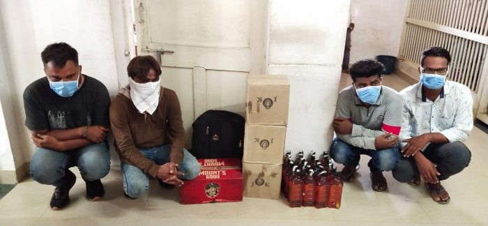 પોલીસ સૂત્રોનાં જણાવ્યાનુસાર તા.૧૦/૦૭/૨૦૨૦ ના રોજ ઇન્સ્પેક્ટર વી.એ.દેસાઇ છોટાઉદેપુર પોલીસ સ્ટેશન સ્ટાફનાં પોલીસ માણસો સાથે છોટાઉદેપુર પો.સ્ટે. વિસ્તારમાં પેટ્રોલીંગમાં હતા દરમ્યાન બાતમી મળેલ કે એક સફેદ કલરની મારૂતી ઓમની વાન ગાડી નંબર GJ-07-AG-4049 ની ગાડીમાં દારૂ ભરી મલાજા થઇ પુનિયાવાંટ તરફ જનાર છે તેવી ચોક્કસ બાતમી આધારે પુનિયાવાંટ નાના ફળીયાના બસ સ્ટેન્ડ પાસે પહોંચી નાકાબંધીમાં હતા દરમ્યાન બાતમી હકીકત મુજબનાં વર્ણનવાળી મારૂતી ઓમની ગાડી આવતી દેખાતા કોર્ડન કરી ગાડીનો ચાલક તથા તેની બાજુની સીટ પર બેસેલ ઇસમ તથા પાછળની સીટ ઉપર બેઠેલ બે ઇસમોને પકડી પાડી (૧) વિશાલભાઇ ગણેશભાઇ જાતે ઝાંજે ઉ.વ.૨૩ ધંધો- ખાનગી નોકરી રહે. વડોદરા શહેર, ૯-સી વિભુતીયોગ સોસાયટી, દંતેશ્વર પ્રતાપનગર વડોદરા શહેર તા.જિ.વડોદરા તથા તેની બાજુની સીટ પર બેસેલ ઇસમ (૨) દિગ્વીજય મહેન્દ્રસિંહ જાતે ભુમેલા ઉ.વ.૨૮ ધંધો- ખાનગી નોકરી રહે. વડોદરા શહેર, બી-૪ અશોકનગર સોસાયટી, દંતેશ્વર તા.જિ.વડોદરા તથા પાછળની સીટ ઉપર બેસેલ (૩) દુર્ગેશભાઇ દિપકરાવ જાતે ગાંગુડે ઉ.વ.૨૬ ધંધો-મજુરી રહે.વડોદરા શહેર, હરીઓમનગર, દંતેશ્વર તા.જિ.વડોદરા તથા તેની બાજુમા બેસેલ ઇસમ (૪) રઘુનાથસિંહ ધિરજસિંહ જાતે ગોહિલ ઉ.વ.૩૨ ધંધો-ડ્રાઇવિંગ રહે. વડોદરા શહેર, રાઘવનગર ચીત્રા સોસાયટીની સામે દંતેશ્વર તા.જિ.વડોદરા નાઓ ભારતીય બનાવટની વિદેશી દારૂની કુલ બોટલ નંગ- ૮૪ કુલ કિં.રૂ. ૩૧,૫૬૦/- નો પ્રોહી મુદ્દામાલની હેરાફેરીમાં ઉપયોગમાં લીધેલ મારૂતી ઓમની વાન ગાડી નંબર GJ-07-AG-4049 ની કિ.રૂ. ૭૦,૦૦૦/- તથા અંગઝડતીના રોકડા રૂપિયા ૧૫૫૦/-તથા મોબાઇલ નંગ-૦૧ કિ.રૂ. ૫,૦૦૦/- મળી કુલ કિં.રૂ. ૧,૦૮,૧૧૦/- નો મુદામાલ તપાસ અર્થે કબજે કરવામાં આવેલ અને તેઓની વિરુદ્ધ પ્રોહી એક્ટની કલમ-૬૫એઇ,૯૮ (૨),૮૧,૮૩,૧૧૬(બી) મુજબનો ગુન્હો દાખલ કરવામાં આવેલ છે અને સહ આરોપીની તપાસ કરીને પકડી પાડી ગુન્હાનાં કામે અટક કરવા સારૂ ચક્રો ગતિમાન કરવામાં આવેલ છે.