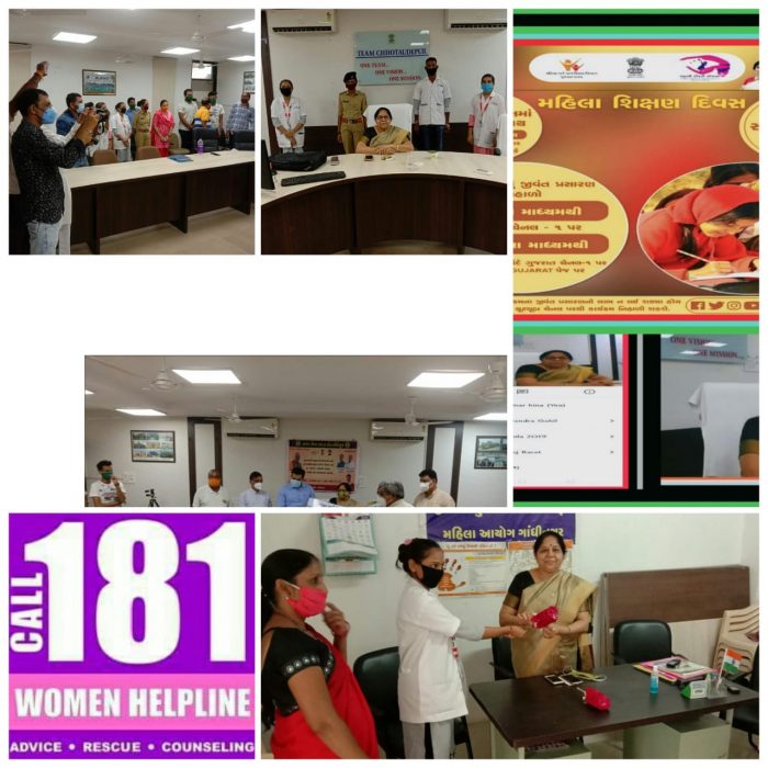 છોટા ઉદેપુર ખાતે વેબિનારનાં માધ્યમથી અભયમ મહિલા હેલ્પલાઇન દ્વારા મહિલા શિક્ષણ દિવસની ઉજવણી કરવામાં આવી રહી છે ત્યારે મહિલા અને બાળ વિકાસ વિભાગ તરફથી મહિલા સશક્તિકરણ પખવાડિયુ ઉજવાઈ રહ્યું છે જેના ભાગ રૂપે આજે વેબિનારના માધ્યમથી મહિલા શિક્ષણ દિવસની ઉજવણી કરવામાં આવી હતી. જે પ્રસંગે ર્ડો રાજુલ દેસાઈ, સભ્યશ્રી નેશનલ મહિલા આયોગ ન્યૂ દિલ્હી અને શ્રીમતી લીલાબેન અંકોલીયા, અધ્યક્ષ રાજ્ય મહિલા આયોગ તરફથી મહિલાઓને વેબિનારનાં માધ્યમ દ્વારા માર્ગદર્શન આપવામાં આવ્યું હતું. રાજ્ય સરકારના મહીલા અને બાળ વિકાસ વિભાગ દ્વારા ઉજવવામાં આવી રહેલ મહીલા સશક્તિકરણ પખવાડિયા અંતર્ગત છોટાઉદેપુર ખાતેથી મીટ એપનાં માધ્યમથી લાઈવ પ્રોગ્રામ દ્વારા મહીલા આયોગના અધ્યક્ષ શ્રીમતી લીલાબેન અંકલીયાએ 181 વિશે માહિતી આપેલ તેમજ છોટાઉદેપુર 181 ટીમની મુલાકાત લીધેલ છે.