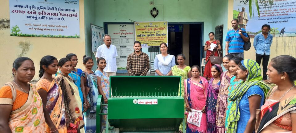 કૃષિ વિજ્ઞાન કેન્દ્ર ડેડીયાપાડા ન.કૃ.યુ ખાતે અગ્રીમ હરોળ નિદર્શન અંતર્ગત ડેડીયાપાડાના જુદા જુદા ગામો મોહબી અને ઘોડી ગામના સ્વયં સહાયતા સમૂહના બહેનોને થાક ઓછો લાગે, મજૂરી ખર્ચ બચે અને કાર્ય ઝડપથી થાય તે હેતુથી ડાંગર ઝૂડવાનું મશીન આપવામાં આવ્યું હતું, ચીલાચાલું પધ્ધતિમાં ડાંગરની લણણી વખતે દાણાનો બગાડ અને વેડફાતો વધુ સમય ઓછો કરવાના હેતુથી આ પ્રકારનું થ્રેસર આપવામાં છે. ડાંગરમાંથી તેના દાણા છૂટા પાડવા માનવશ્રમ ઉપરાંત ઈલેકટ્રીક મોટરથી સંચાલિત પેડી થ્રેસરનો ઉપયોગ કરવામાં આવતો હોય છે. આ પગ સંચાલિત પેડી થ્રેસરમાં ઈલેકટ્રીક મોટર વગેરે ગોઠવી કરી તેના દ્ધારા ડાંગર ઝુંડવાનું કાર્ય થતું હોય છે. આ સાધનમાં ઉપયોગ વખતે ડાંગરના પૂળાને પકડી રાખવો પડતો હોય છે. થ્રેસરમાં ડાંગરના પૂળા પકડાઈ, ઝૂડાઈને બહાર આપોઆપ એવાને એવા નીકળે છે. જેથી તેનો ઉપયોગ પશુઓના ચારા તરીકે કરી શકાય છે. ડાંગર સાફ અને ચોખ્ખી નીકળે છે જેને ઉપણવી પડતી નથી. મજૂરથી ઝૂડેલ પૂળામાં ડાંગર રહી જતી હોય છે, જે આ થ્રેસરથી ઝૂડેલ ડાંગર પુળીયામાં રહેતી નથી. આ થ્રેસરથી ૧ વિઘાની ડાંગર કાઢતા લગભગ ૧.પ કલાક જેવો સમય લાગે છે. આ યંત્ર દ્વારા ઝડપથી કાર્ય થતું હોય મજૂરીની બચત થાય છે.