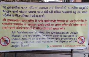 દ્વારકાનું જગતમંદિર હિન્દુ ધર્મનું પ્રમુખ ધર્મસ્થાન છે અને દરરોજ હજોર શ્રદ્ધાળુઓ મંદિરે દર્શન કરવા આવે છે ત્યારે હવે દર્શનાર્થે આવતા ભક્તો માટે એક નિર્ણય કરવાનો આવ્યો છે જેમાં મંદિરના પરિસરમાં ટૂંકા વસ્ત્રો સાથે પ્રવેશ પર પ્રતિબંધ મૂકવામાં આવ્યો છે. અને આ સાથે જ મંદિરની બહાર મોટા બેનર પણ લગાવાયા છે. ઉલ્લેખનીય છે કે દરરોજ હજારોની સંખ્યામાં આવતા દર્શનાર્થી આવતા હોય છે જેને લઈને હવે સંસ્કૃતિને શોભે તેવા વસ્ત્રો પહેરીને આવવા અપીલ કરવામાં આવી છે.