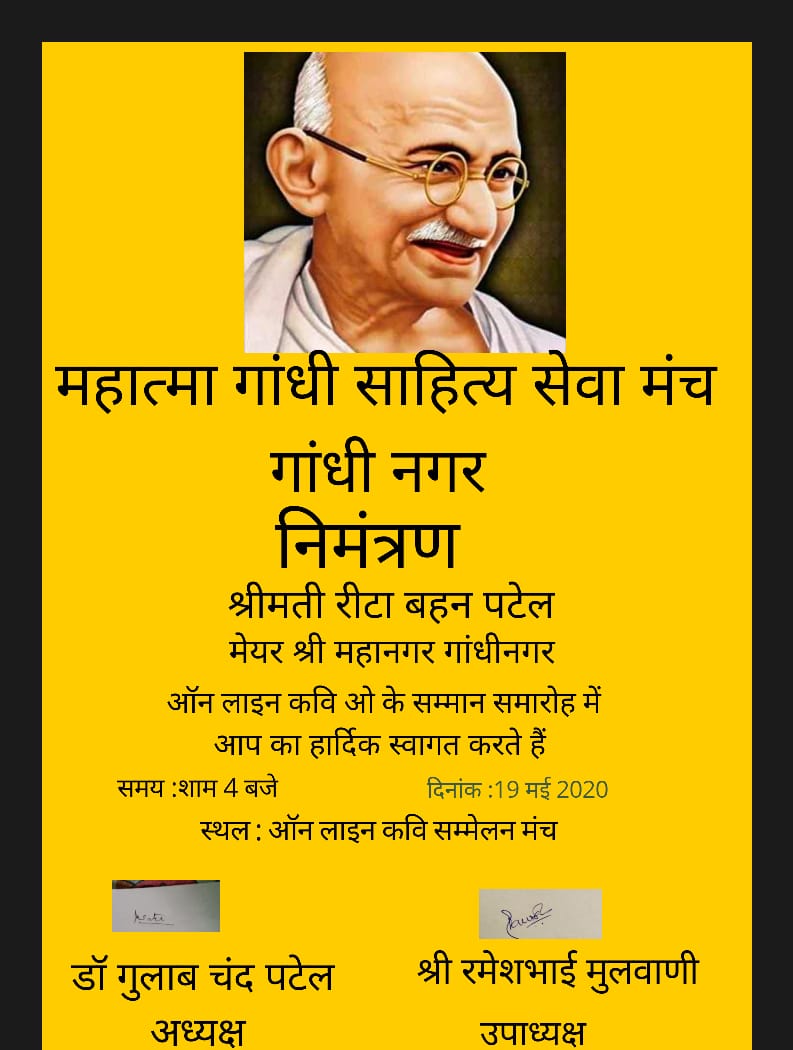 મહાત્મા ગાંધી સાહિત્ય સેવા સંસ્થા ગાંધીનગર દ્વારા તારીખ ૧૯ મે ૨૦૨૦ ના રોજ આયોજિત ઑનલાઈન કવિ સન્માન સમારોહમાં ગાંધીનગર મહાનગરનાં મૅયર શ્રીમતી રીટાબેન પટેલ ઉપસ્થિત રહી 4 વાગે કવિઓને સમ્માનિત કરશે. મહાત્મા ગાંધી સાહિત્ય સેવા સંસ્થા ગાંધી નગર દ્વારા તારીખ ૧૭ મે ૨૦૨૦ નાં રોજ આયોજિત હિન્દી કવિ સંમેલનમાં જોડાયેલ ભારતના ૬૭ કવિ નોંધાયા હતા અને ૬૫ કવિઓએ પોતાની રચના પ્રસ્તુત કરી હતી, તેઓને “હરિવંશ રાય બચ્ચન” સન્માનથી સમ્માનિત કરવામાં આવશે.