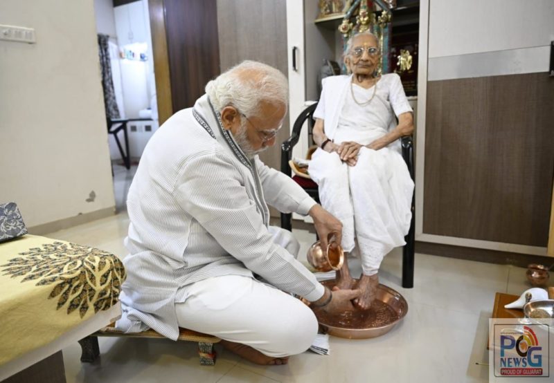 નરેન્દ્ર મોદી ભારતના ભલે પ્રધાનમંત્રી હોય પણ આજે હીરાબાને એક લાડકવાયા સમાન માતાને મળવા પહોંચ્યા હતા, અને મોં મીઠું કરાવી તેમને ફૂલની માળા પહેરાવી હતી અને ચરણવંદના કરી હતી.