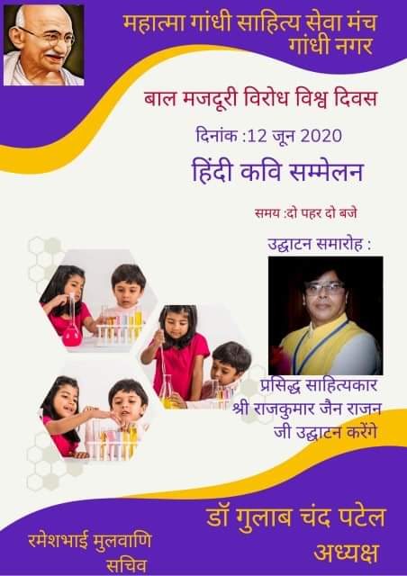 વિશ્વ બાળ મજૂરી વિરોધ દિવસ નિમિતે તારીખ ૧૨ જૂન ૨૦૨૦ ના રોજ બપોરે બે વાગ્યે મહાત્મા ગાંધી સાહિત્ય સેવા સંસ્થા ગાંધી નગર ના પ્રમુખ શ્રી ડૉ ગુલાબચંદ પટેલ દ્વારા ઑન લાઈન કવિ સંમેલન આયોજિત કરવામાં આવ્યું છે. આ સંમેલન નું ઉદ્ઘાટન આદરણીય શ્રી રાજકુમાર જૈન રાજન પ્રસિધ્ધ હિન્દી સાહિત્યકાર દ્વારા કરવામાં આવશે. શ્રીરાજકુમાર જૈન રાજન અકોલા ચીતોડ ગઢ રાજસ્થાન ના વતની છે. તેઓ દર વર્ષે બાળ સાહિત્ય માં વિશિષ્ટ કામગીરી કરનાર બાળ સાહિત્યકારો નું સન્માન કરે છે. તેઓએ ચાર લાખ રૃપિયા ના બાળ સાહિત્ય ના પુસ્તકો શાળા ઓ મા વિના મૂલ્યે વિતરણ કર્યાં છે.શ્રી રાજકુમાર જૈન હાલ માં વડોદરા થી પ્રકાશિત કરવામાં આવતી સંગીની હિન્દી પત્રિકા ના સહ સંપાદક છે. તેઓને ઘણા બધા સન્માન અને પુરસ્કારો પ્રાપ્ત થયેલા છે. અધ્યક્ષ શ્રી મહાત્મા ગાંધી સાહિત્ય સેવા સંસ્થા ગાંધી નગર ના ડૉ ગુલાબચંદ પટેલ ને તેઓના સન્માન સમારંભ માં ચીતોડ ગઢ ખાતે રૂપિયા ૨૧૦૦ ની રાશિ સાથે અંબાલાલ હિંગડ અવાર્ડ થી રાજકુમાર ફાઉંડેશન રાજસ્થાન દ્વારા સમ્માનિત કરવામાં આવ્યા છે.