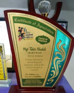 સમગ્ર દેશ અને દુનિયામાં કોરોના મહામારી વચ્ચે દિન-રાત ખડેપગે રહી નિષ્ઠાપૂર્વક અને પોતાના પરિવારની ચિંતા કર્યા વગર દેશ અને માનવતાનાં હિત માટે પોતાની સેવા આપવા બદલ સહારા એજયુકેશન એન્ડ ચેરીટેબલ ટ્રસ્ટ ગોધરા દ્વારા હાજી તાહીર ભટુક(બાબા હાજી) કોરોના વોરિયર્સ સન્માનપત્ર અને ટ્રોફી એનાયત કરી સન્માનિત કરાયા હતા.કોરોના મહામારી વચ્ચે રાશન અનાજની કીટ વિતરણની કામગીરી તથા અંતરિયાળ ગ્રામ્ય વિસ્તારોમાં વસતા ગરીબ પરિવારોને બે ટંક ભોજન અને કોરોના સાવચેતી માટે જાગૃતિ સંદેશ સાથે સાબુ, માસ્ક સેનેટાઈઝ વિતરણ કરવામાં આવેલ હતા. સાથે નાના બાળકોને નાસ્તો વિતરણ કરવાની કામગીરી હાથ ધરી હતી. ગોધરાની જાણીતી સેવાભાવી સંસ્થા સહારા એજયુકેશન એન્ડ ચેરીટેબલ ટ્રસ્ટ ગોધરા દ્વારા જિલ્લામાં કોરોનાની મહામારી અને લોકડાઉનની પરિસ્થિતિમાં અડીખમ ઊભા રહી ગરીબ પરિવારોની મદદ કરતા શાંતિ-સલામતિ-તંદુરસ્તી તથા સેવાના પ્રતિકસમા હાજી તાહીર ભટુક(બાબા હાજી) ‘કોરોના વોરિયર્સ-સન્માનપત્ર અને ટોફી આપીને સન્માનિત કર્યા હતા.