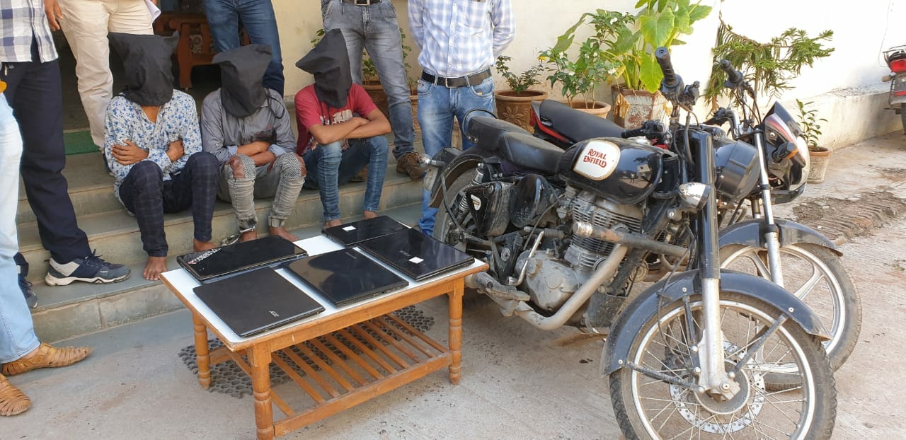 પંચમહાલ જીલ્લાના હાલોલ ટાઉન પોલીસ દ્વારા પેટ્રોલિંગ દરમિયાન હાલોલનગરના પનોરામા ચોકડી પાસે ઉભી હતી. તે દરમિયાન બુલેટમોટરસાઈકલ ઉપર આવતા ત્રણ ઈસમો હાર્દિકકુમાર ભોઈ, જીતેન્દ્રકુમાર પરમાર, જયેન્દ્રસિંહ પરમારનેઊભા રાખીને પુછપરછ કરતા તેમની પાસે રહેલુ બુલેટમોટરસાઈકલ બોટાદ ખાતેથી ચોરી કર્યુ હોવાનુ જણાવ્યુ હતુ તેમજ તેમની પાસેથી એક લેપટોપ પણ કબ્જે કર્યુ હતું. આ સિવાય તેમની વધુ પુછપરછ કરતા હાલોલ પોલીસ સ્ટેશન અને ગોધરા શહેર એડીવીઝન પોલીસ સ્ટેશનના ગુનાઓનો પણ ભેદ ઉકેલાયો હતો.જેમા બે લેપટોપ તેમજ એક સીડીડીલક્સબાઈક તેમજ મોબાઈલ પણ પોલીસે કબજે કર્યા હતા.