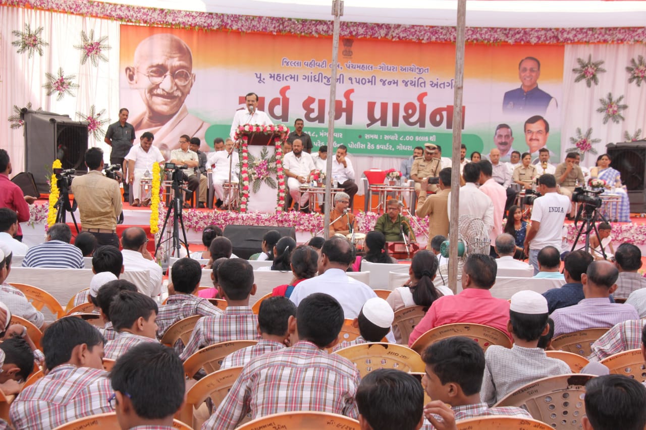 ગોધરાના પોલીસ હેડ ક્વાટર્સ ખાતે યોજાયેલી સર્વધર્મ પ્રાર્થના સભામાં, વૈષ્ણવ જન તો તેને રે . . ., રઘુપતિ રાઘવ . . ., ઇતની શક્તિ હમે . . ., તુ હી રામ તુ હી રહીમ . . ., સાબરમતી કે સંત . . . જેવા ભજન-કિર્તનો અને ગાંધીજીના વિચારોનું વાંચન કરવામાં આવ્યું હતું. કરિયા ઉર્દુ કન્યા શાળાની બાલિકા શેખ વસીયાબાનુએ બાળ શિક્ષણ વિશે ગાંધીજીના વિચારો રજુ કર્યા ત્યારે મંત્રી શ્રી, મહાનુભાવો અને સભામાં ઉપસ્થિત સૌકોઇએ તાળીઓના ગડગડાટથી વધાવી લીધી હતી.