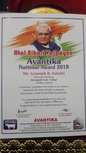 પંચમહાલ જીલ્લાના ગોધરા ખાતે આવેલી સાર્વજનિક કોમર્સ કોલેજમાં ફરજ બજાવતા અરુણસિંહ સોલંકીને નવી દિલ્હી ખાતે તેમની શિક્ષણની સાથે સાથે સેવાકીય સામાજીક પ્રવૃતિ માટે નેશનલ કક્ષાનો એવોર્ડ મળ્યો છે.જેમાં ઈન્ડીયન ઈન્ટરનેશનલ સેન્ટર ખાતે આયોજીત સંભારભમાં ડો એસ કે નંદા (આઈએએસ) તેમજ અનિલ પ્રથમ (આઈપીએસ) તેમજ તેજેન્દ્રપાલ ત્યાગી વીરચક્ર એવોર્ડ ડો આનંદ અગ્રવાલની ઉપસ્થિતીમાં ‘‘ અટલ બિહારી વાજપાઈ અંવતિકા એવોર્ડ” આપવામા આવ્યો હતો. આ એવોર્ડ મળતા ગોધરા શહેરના અધ્યાપક આલમમા પણ ખુશીની લાગણી વ્યાપી ગઈ છે. તેની સાથે સાથે ગોવિંદગુરૂ યુનિર્વસીટીનું પણ ગૌરવ વધાર્યુ છે