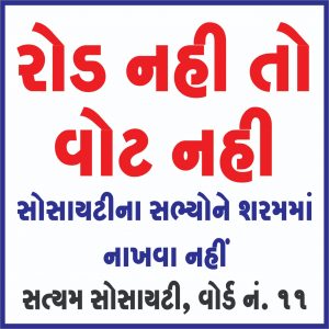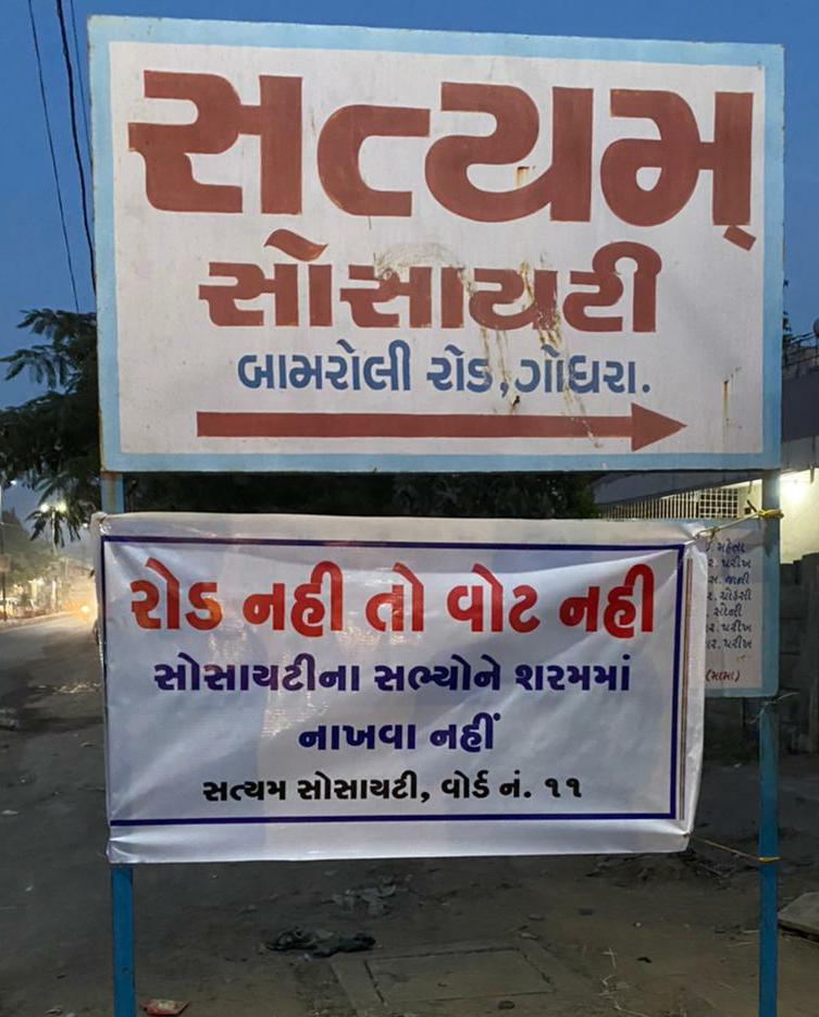 ગોધરામાં વોર્ડ નંબર 11 આવેલ સત્યમ સોસાયટી ખાતે ગતિશીલ ગુજરાતની ઊભી કરાયેલી હવા નીકળી જાય તેવા દ્રશ્યો ઠેર ઠેર જોવા મળશે મોટા ભાગના સોસાયટી વિસ્તારોમાંથી પસાર થતા રોડ અને રસ્તાઓની સ્થિતિ અને કેટલાય વિસ્તારો પાકા રસ્તાથી વંચિત હોવાથી વાઇબ્રન્ટની અસરનો અહેસાસ સ્થાનિક રહીશો અનુભવી રહ્યા છે. સ્થાનિક સ્વરાજ્યની ચૂંટણી જાહેર થતા મતદારો પણ ઉમેદવારો અને રાજકીય પાર્ટીઓના નાક દબાવવા વર્ષો જૂની માંગણીઓ આગળ ધરી “કામ નહીં તો વોટ નહીં” નો વિરોધ નોંધાવી સંતોષ વ્યક્ત કરતા હોય છે. ત્યારે ગોધરામાં આવેલ સત્યમ સોસાયટીના રહીશો રોડથી વંચિત રહેતા ચૂંટણી બહિષ્કારની ચીમકી ઉચ્ચારી સોસાયટીના યુવાનો અને અગ્રણીઓએ રસ્તાની માંગ સાથે ચૂંટણીનો વિરોધ કરતા બેનર સોસાયટીનાં ગેટ આગળ લગાવ્યા છે.