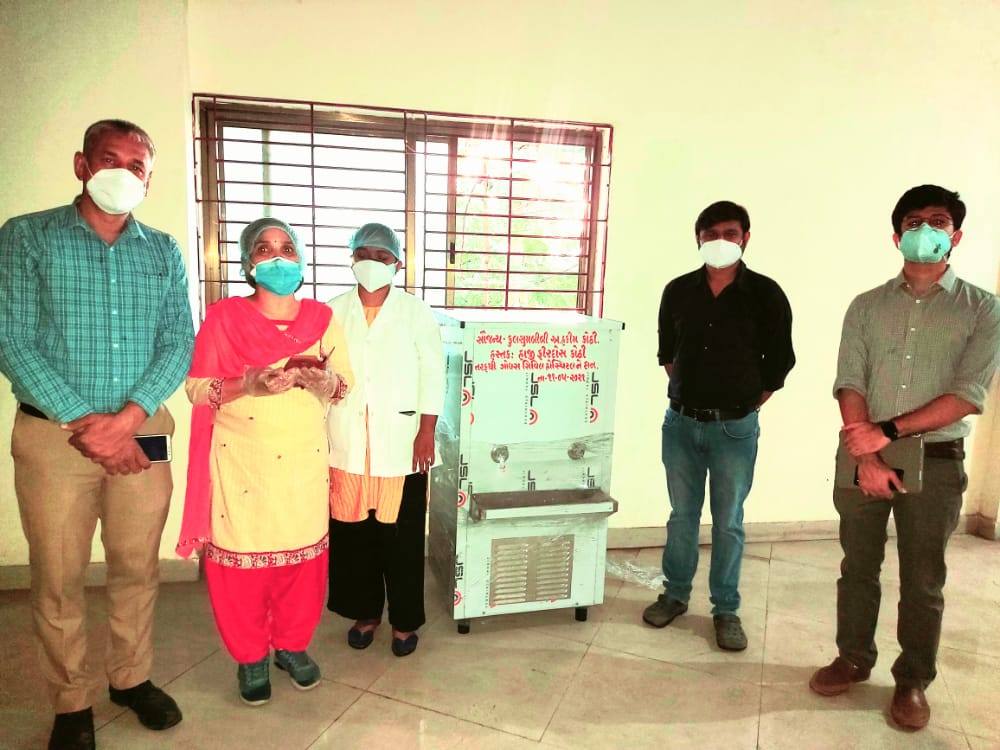 ગોધરામાં કોરોનાના વધતા જતા વ્યાપની સામે સરકારી સિવિલ હોસ્પિટલમાં દર્દીઓની સંખ્યામા નોંધપાત્ર વધારો જોવા મળી રહ્યો છે ત્યારે સારવાર સહિત તેમની જરૂરિયાતો પૂરી થાય તે જરૂરી હોય છે હાલ ઉનાળાની કાળઝાળ ગરમીમાં પીવાના પાણીની અછત દુર કરવા અને દર્દીઓને પીવાના પાણીની મુશ્કેલી ન પડે તે માટે ગોધરા જાણીતા ઉધોગપતિ હાજી ફિરદોસ કોઠી (હાજી બાવા) એ ગોધરા સિવિલ હોસ્પિટલ સામે બનાવેલ નર્સિંગ કોવિડ સેન્ટરમાં 100 લીટરનું ઈલેક્ટ્રોનિક વોટર કૂલર દાન કર્યું હતું. આ વોટર કૂલર સ્થાનિક સિવિલ સર્જન ડૉ. પિનલ ગાંધી સહિત આર એમ ઓ ડૉ. મયુરી બેન શાહના હસ્તક લોકાર્પણ કરવામાં આવ્યુ હતુ.