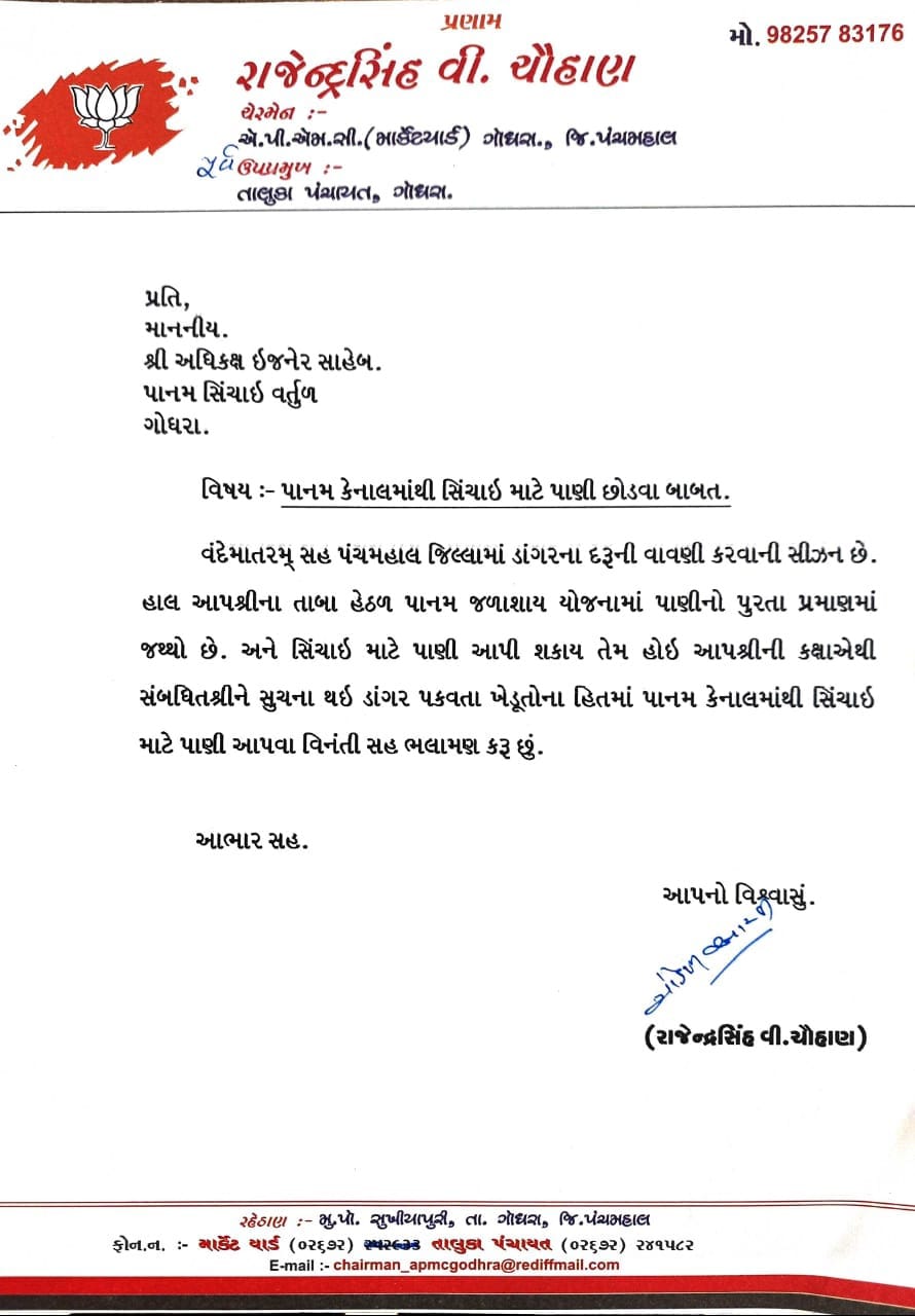 પંચમહાલ જિલ્લાનું મુખ્ય પાક ડાંગરનો છે અને હાલ ચોમાસામાં ડાંગરના ધરું કરવા માટે પાણીની ખૂબ જરૂરિયાત છે. પાનમ જળાશયમાં પાણીનો જથ્થો મળી રહે તથા આગામી ટૂંક સમયમાં ચોમાસામાં પાનમ જળાશયમાં પાણીની આવકમાં પણ વધારો થવાનો છે. જેથી સિંચાઈ માટે પાણી આપી શકાય તેમ છે જેના કારણે પંચમહાલના ડાંગર પકવતા ખેડૂતોના હિતમાં પાનમ જળાશય અને હાઈલેવલ કેનાલમાંથી સિંચાઈ માટે પાણી આપવા અધિક્ષક ઈજનેર, પાનમ સિંચાઈ વર્તુળને બજાર સમિતિ ગોધરાના ચેરમેન રાજેન્દ્રસિંહ વી. ચૌહાણ દ્વારા આવેદનપત્ર મારફતે ભલામણ કરવામાં આવેલ છે.