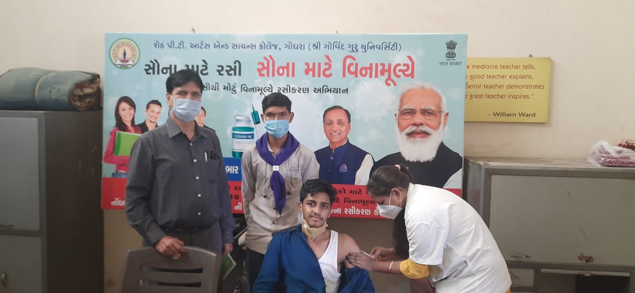 ગોધરાની જાણીતી, શેઠ પી.ટી.આર્ટસ એન્ડ સાયન્સ કોલેજ ખાતે તા. 22-6-2021 ના રોજ કોવિડ19 વેક્સિનેશન કેમ્પ યોજાયો હતો જેમાં ખુબ જ ઉત્સાહપૂર્વક 170 થી પણ વધૂ વિદ્યાર્થીઓએ કોવિડ 19 રસી મુકાવી હતી. કાર્યક્રમમાં ગોવિંદ ગુરુ યુનિ. ના કુલપતિ પ્રોફેસર પ્રતાપસિંહ ચૌહાણ સાહેબે ખાસ હાજરી આપી હતી અને વિદ્યાર્થીઓને વેક્સિનેશન માટે પ્રોત્સાહિત કર્યા હતા. તેમણે ખાસ વિદ્યાર્થીઓને રસી લીધા પછી પણ માસ્ક પહેરવું, ઉપરાંત સોસિયલ ડિસ્ટન્સ જાળવવા ખાસ અપીલ કરી હતી.