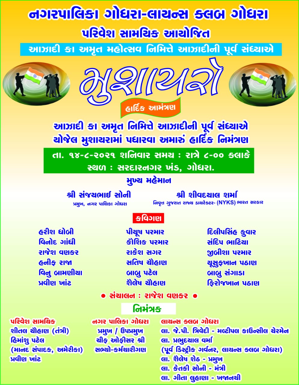 આઝાદી કા અમૃત મહોત્સવ નિમિત્તે ગોધરા સરદાર નગરખંડ ખાતે નગરપાલિકા ગોધરા, લાયન્સ ક્લબ ગોધરા તથા પરિવેશ સામયિક આયોજિત ભવ્ય મુશાયરો તા.14 ઓગસ્ટના રોજ રાતે 8 કલાકે ગોધરા નગરપાલિકા પ્રમુખ સંજય સોની અને શિવદયાલ શર્માના મુખ્ય મહેમાન પદે યોજાશે. જેમાં પંચમહાલ મહીસાગર દાહોદ વડોદરા છોટાઉદેપુર અમદાવાદના નામાંકિત ગઝલકારો કવિઓ આઝાદી લક્ષી રચનાઓનું પઠન કરશે. જેમાં વિનોદ ગાંધી, હરિશ ધોબી, હનીફ રાજા, પિયુષ પરમાર, રાજેશ વણકર, પ્રવીણ ખાંટ, વિનુ બામણીયા, રાકેશ સાગર, કૌશિક પરમાર’ઉસ્તાદ’, શૈલેષ ચૌહાણ, સતીષ ચૌહાણ, બાબુ પટેલ’બીલે’, સંદીપ ભાટિયા, દિલીપસિંહ પુવાર, જીબીશા પરમાર, યુસુફખાન પઠાણ, ફિરોઝખાન પઠાણ, પિયુષ કનેરીયા વગેરે કવિઓ આઝાદીનો ઉત્સવ ગઝલ દ્વારા ઉજવશે. સાહિત્યરસિક મિત્રોએ કાર્યક્રમમાં કોવિડ-19 ના નિયમોનું ચુસ્તપણે પાલન કરી મુશાયરો માણવા આયોજકોની અપીલ છે.