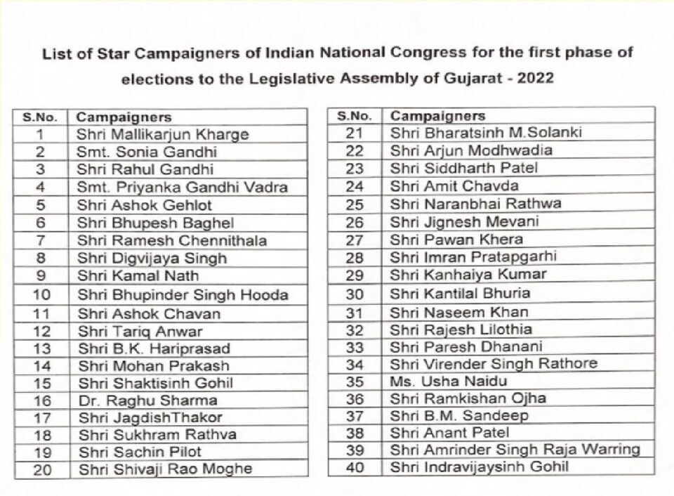 ગુજરાતમાં આગામી વિધાનસભા ચૂંટણી માટે કોંગ્રેસે આજે તેના સ્ટાર પ્રચારકોની યાદી જાહેર કરી છે. આ યાદીમાં પાર્ટી ચીફ મલ્લિકાર્જુન ખડગે, યુપીએ ચેરપર્સન સોનિયા ગાંધી, પાર્ટીના પૂર્વ અધ્યક્ષ રાહુલ ગાંધી, મહાસચિવ પ્રિયંકા ગાંધી વાડ્રા, રાજસ્થાનના સીએમ અશોક ગેહલોત, છત્તીસગઢના સીએમ ભૂપેશ બઘેલ, સચિન પાયલટ, જિજ્ઞેશ મેવાણી અને કન્હૈયા કુમાર સહિત અન્ય ઘણા લોકોનો પણ સમાવેશ થાય છે. સ્થાન મળ્યું.