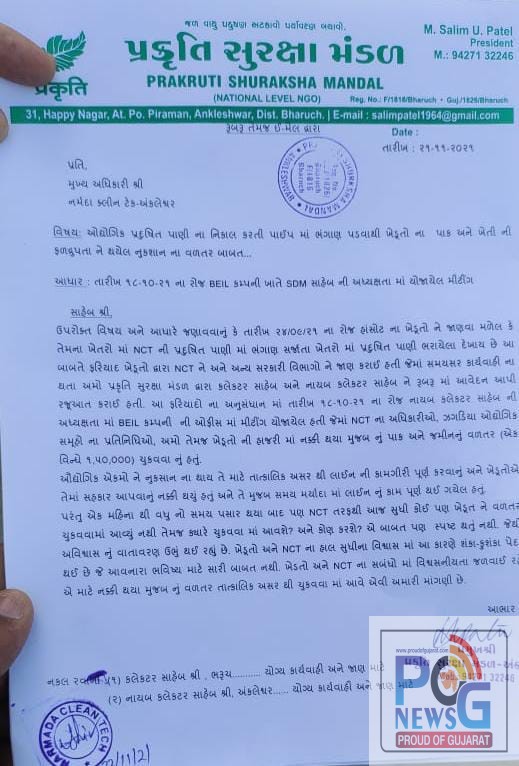 હાંસોટ ખાતે NCT ની પાઈપમાં ભંગાણ પડવાથી ઉદ્યોગોનું પ્રદૂષિત પાણી ખેતરમાં પ્રવેશતા કલેકટર સમક્ષ નુકસાન વળતર ચૂકવવાની માંગણી કરતું પ્રકૃતિ સુરક્ષા મંડળ.