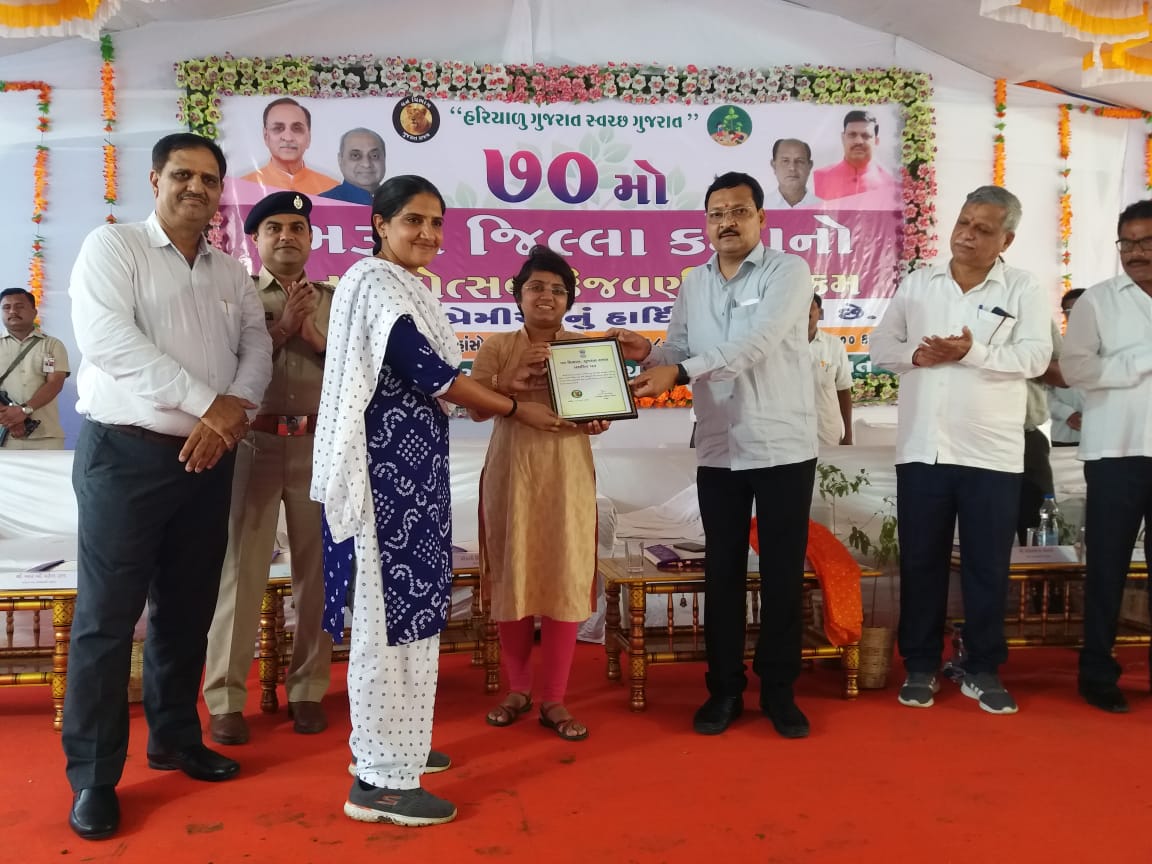 જિલ્લા કક્ષાના વન મહોત્સવની ઉજવણી માં રાજયકક્ષાના રમતગમત મંત્રી ઇશ્વરસિંહ પટેલ અને જિલ્લા કલેકટર ક્ષિપ્રા આગ્રે એ હાજરી આપી હતી. જેમાં જિલ્લાના 17 જેટલા પ્રગતિશીલ ખેડૂતોને સન્માનિત કરી પ્રશસ્તિપત્ર એનાયત કરવામાં આવ્યા હતા. સાથે સાથે સામાજિક વનીકરણ વિભાગના અધિકારીઓને પણ જિલ્લામાં શ્રેષ્ઠ કામગીરી બદલ પણ સન્માનિત કરવામાં આવ્યા હતા. જ્યારે અંકલેશ્વર તાલુકાના ઉટિયાદરા ગામના સરપંચે વનમહોત્સવમાં કંઇક અલગ રીતે જ વૃક્ષારોપણ કરાવવાની જાહેરાત કરી હતી. તેઓએ જો ઉટિયાદરાના ગ્રામજન પોતાની જમીનમાં કે ગામની જમીનમાં 11 વૃક્ષો વાવી ઉછેર કરશે તો પંચાયત દ્વારા તેમનો વેરો માફ કરવાની જાહેરાત તેમજ ગામમાં સૌથી વધુ વૃક્ષો વાવી તેનો ઉછેર કરનારને 3 વર્ષ બાદ 25000, 11000 અને 5000 એમ ત્રણ ક્રમાંક માં રોકડ રકમ ઇનામ સ્વરૂપે એનાયત કરવાનું જણાવેલ. નાયબ વન સરંક્ષક આર.બી. પટેલ તેમજ મદદનીશ વનસંરક્ષક ભાવનાબેન દેસાઇ સહિત વન વિભાગના અધિકારીઓને પણ શ્રેષ્ઠ કામગીરી બદલ સન્માનીત કરાયા હતા.