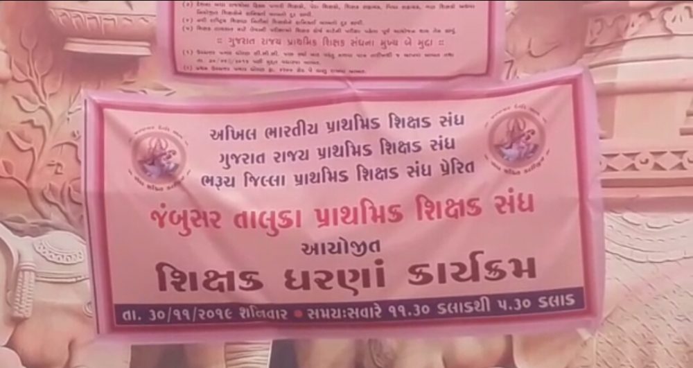 જંબુસર તાલુકાનાં પ્રાથમિક શિક્ષકસંધ દ્વારા અપાયેલ ધરણાંના કાર્યક્રમમાં શહેર સહિત તાલુકાનાં શિક્ષકો હાજીકન્યા શાળાના કમ્પાઉન્ડમાં વિવિધ પડતર માંગણીઓને લઈ મોટી સંખ્યામાં ધરણાં પર ઉતર્યા હતા.