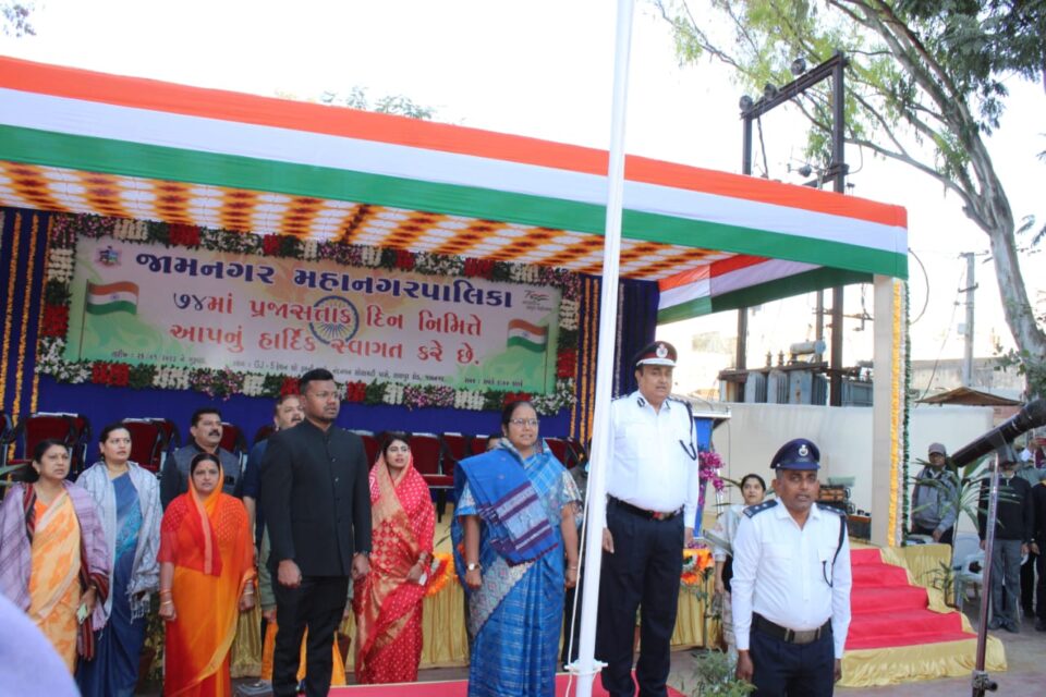 જામનગર મહાનગરપાલિકા દ્વારા સાધના કોલોની નંદનવન પાર્ક ખાતેG J-5 ફેશન શો રૂમ પાસે 74 માં પ્રજાસત્તાક પર્વ નિમિત્તે ધ્વજ વંદન કાર્યક્રમ યોજાયો હતો. આ કાર્યક્રમમાં શહેર મેયર બીનાબેન કોઠારી એ રાષ્ટ્રધ્વજને સલામી આપી હતી. આ તકે મેયર બીનાબેન કોઠારી એ પોતાના પ્રસંગિક પ્રવચનમાં જણાવ્યું હતું કે આજે આપણે 74 મો પ્રજાસત્તાક પર્વ ઉજવી રહ્યા છીએ ત્યારે દેશના બંધારણના ઘડવૈયાઓને યાદ કર્યા હતા તેમજ જણાવ્યું હતું કે વિશ્વનું સર્વ શ્રેષ્ઠ લેખિત બંધારણ ભારતનું બંધારણ છે આ સાથે જ ગુજરાત સરકાર અને જામનગરના વિકાસની વાત કરતા વર્ણવ્યું હતું કે જામનગર એ આજે દરેક ક્ષેત્રમાં વિકાસ કર્યો છે તેમજ આગામી સમયમાં સ્માર્ટ સિટી ઇન્ડેક્સ માટે પણ જામનગર પ્રયત્નશીલ છે હાલ જામનગર તમામ દિશાઓમાં વિકાસની હરણફાળ ભરી રહ્યું છે. ઓવરબ્રિજ, દરેક વોર્ડમાં સ્ટ્રોંમ વોટર સિસ્ટમ સહિતના વિકાસ કાર્યો જામનગર મહાનગરપાલિકા દ્વારા હાથ ધરવામાં આવ્યા છે તેમજ અહીં આપણે અંગદાન કરનાર પરિવારોનું પણ સન્માન કરવાના છીએ એક સર્વે મુજબ સમગ્ર દેશમાં ગુજરાત રાજ્ય અંગદાન કરવામાં મોખરે છે. આગામી સમયમાં શહેરનો વિકાસ વધુને વધુ ચારે દિશાઓમાં ફેલાય તે માટે જામનગર મહાનગરપાલિકાના પદાધિકારીઓ અને અધિકારીઓ હંમેશા પ્રયત્નશીલ રહેશે.
