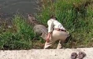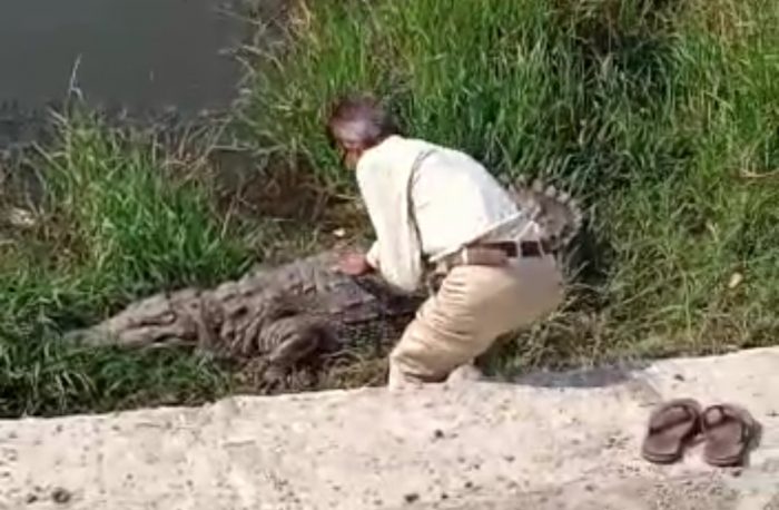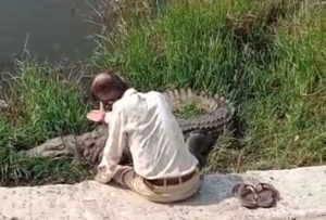 તળાવમાં મગર સાથે વાતો કરતા વ્યક્તિનો વિડિયો વાઈરલ થયો છે. આ વ્યક્તિ જીવના જોખમે મગર પર હાથ ફેરવીને તેને નમન કરે છે અને જોકે મગર હુમલો કર્યાં વિના જ પાણીમાં જતો રહ્યો છે. વિડીયોમાં લોકોની વાતો પરથી જણાય છે કે પંકજ નામનો વ્યક્તિ મગર સાથે સંવાદ કરી રહ્યો છે. વાઇરલ વિડીયો કરજણના જુના બજાર વિસ્તારમાં આવેલા તળાવનો હોવાનું મનાઇ રહ્યું છે. જોકે આ અંગે કોઇ સત્તાવાર માહિતી પ્રાપ્ત નથી.