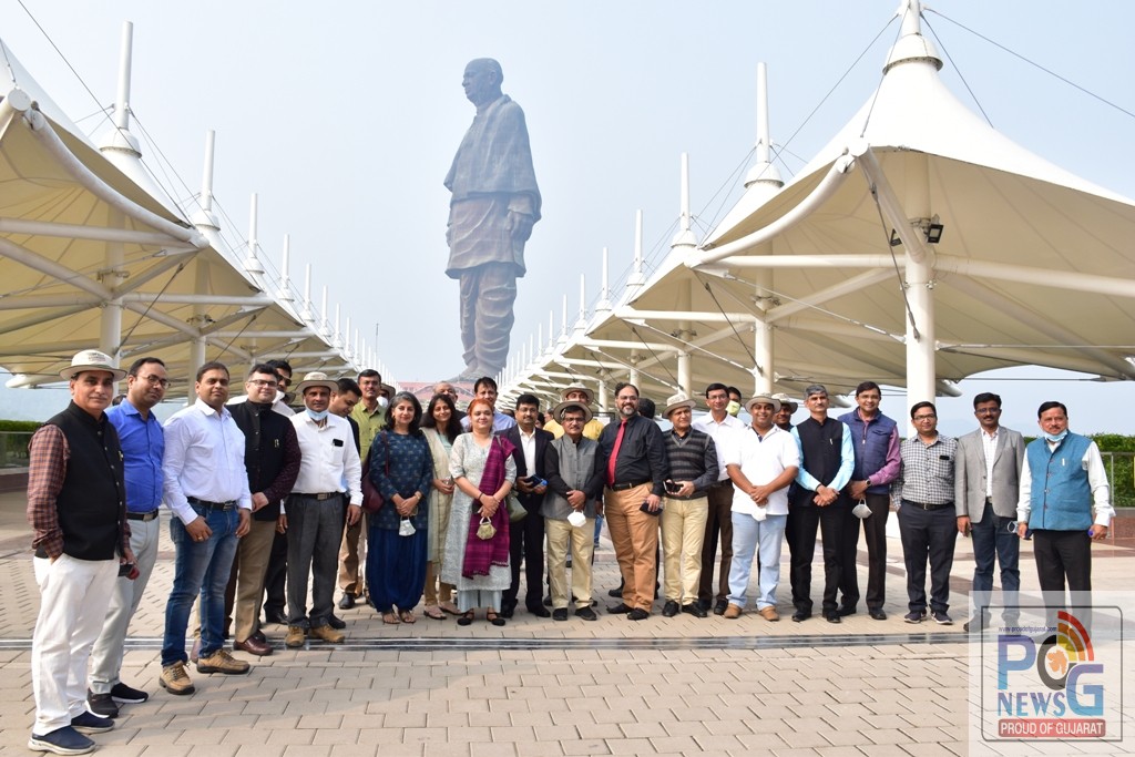 આજે બીજા દિવસે નર્મદા જિલ્લાના કેવડીયા કોલોની ખાતે સ્ટેચ્યુ ઓફ યુનિટીની મુલાકાત લીધી હતી જેમાં, ૪૫ માળની ઉંચાઇએ સ્ટેચ્યુ ઓફ યુનિટીની વ્યુઇંગ ગેલેરી પ્રતિમાના હદય સ્થાનેથી નર્મદા ડેમનો અદભૂત નજારો પણ માણ્યો હતો. તદ્દઉપરાંત વિધ્યાંચળ-સાતપુડા ગિરીમાળાનું પ્રાકૃતિક સૌંદર્ય નિહાળવાની સાથે “મા નર્મદાના” પવિત્ર દર્શન થકી અલૌકિક ઉંચાઇએ પહોંચ્યાની અનુભૂતિ કરી હતી. ત્યારબાદ સ્ટેચ્યુ ઓફ યુનિટીમાં પ્રદર્શન, લાયબ્રેરી, સરદાર સાહેબના જીવન કવનને વણી લેતી દસ્તાવેજી ફિલ્મ પણ નિહાળી હતી. આ મુલાકાત દરમિયાન સ્ટેચ્યુ ઓફ યુનિટીના ગાઈડ શ્રી મયુરસિંહ રાહુલજી, જયંતીભાઈ અને શાહીનબેન મેમણ સહિત અન્ય ગાઈડે સ્ટેચ્યુ ઓફ યુનીટીની વિસ્તૃત જાણકારી પુરી પાડી હતી.