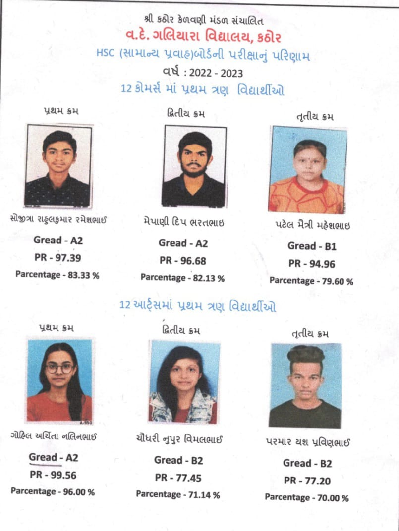 ગુજરાત બોર્ડ દ્વારા માર્ચ મહિનામાં લેવાયેલ ધોરણ 12 સામાન્ય પ્રવાહની પરીક્ષામાં કઠોરની શ્રી કઠોર કેળવણી મંડળ સંચાલિત વ.દે.ગલિયારા વિદ્યાલયનું 75.15% પરિણામ આવ્યું. જેમાં કોમર્સમાં પ્રથમ ક્રમે સોજીત્રા રાહુલના પી.આર.97.39%, દ્વિતીય ક્રમે મેપાણી દીપ પી.આર. 96.68%, ત્રીજા ક્રમે પટેલ મૈત્રી પી.આર.94.96% આવ્યા હતા. આર્ટસ વિભાગમાં પ્રથમ ક્રમે ગોહિલ અર્ચિતા 99.56% , દ્વિતીય ક્રમે ચૌધરી નૂપુર,77.45%, ત્રીજા ક્રમે પરમાર યશ 77.20% પ્રાપ્ત કરતા ટ્રસ્ટી મંડળે અને સ્ટાફગણે અભિનંદન પાઠવ્યા છે.
