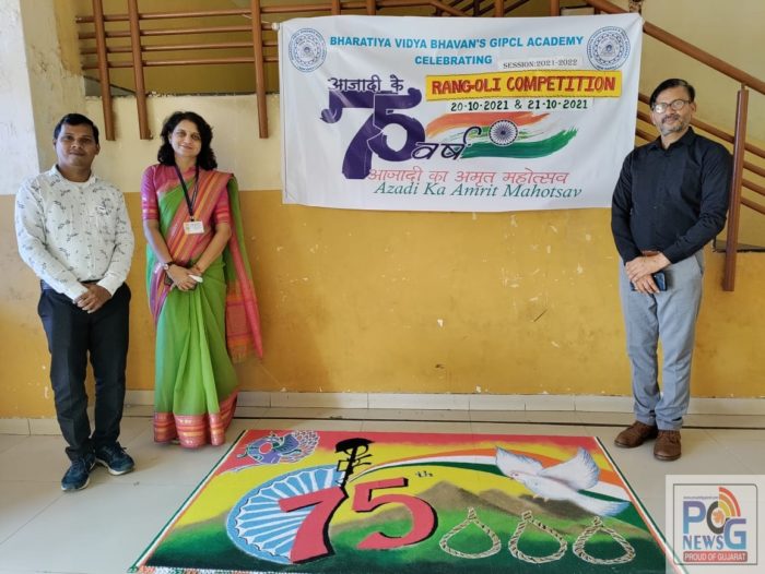 માંગરોળ તાલુકાના નાની નરોલી ગામે કાર્યરત ભારતીય વિદ્યા ભવન G.I.P.C.L એકેડમીમાં 75 માં આઝાદીના અમૃત મહોત્સવની ઉજવણી નિમિત્તે વિદ્યાર્થીઓએ આઝાદીની થીમ પર અલગ-અલગ નવરંગી આકર્ષક રંગોળી બનાવી આઝાદીના અમૃત મહોત્સવની ઉજવણી કરી હતી.