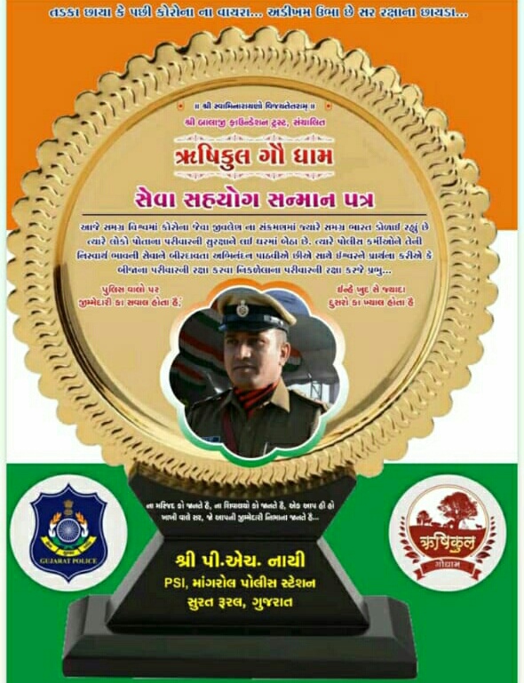 સુરત જિલ્લાના માંગરોળ તાલુકા મથકના પી.એસ.આઈ. પરેશ કુમાર નાયીનું ઋષિ કુલ ગૌ ધામ દ્વારા સન્માન કરાયું. સમગ્ર દેશમાં કોરોનાએ હાહાકાર મચાવ્યો છે તેવા સમયે ખડે પગે ઉભા રહી સેવા કરનાર પોલીસ કર્મચારી અને સ્ટાફ સેવા બજાવે છે. ત્યારે માંગરોળનાં પી.એસ.આઈ પરેશ એચ નાયીનું ફાઉન્ડેશન ટ્રસ્ટ સંચાલિત ઋષિ કુલ ગૌધામ દ્વારા સન્માન કરવામાં આવેલ હતું.