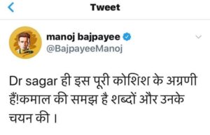 અભિનેતા મનોજ બાજપેયીએ ડૉ. સાગર વિશે પોતાના વિચારો વ્યક્ત કરતાં કહ્યું, “ડૉ. સાગર આ પ્રયાસમાં સૌથી આગળ છે, શબ્દો અને તેમની પસંદગીની અદભૂત સમજ ધરાવે છે.”