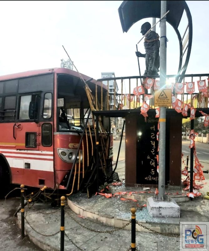 મળતી વિગતો અનુસાર નડિયાદમાં સરદાર ભવન નજીક આવેલ ગાંધીજીની પ્રતિમા પાસેથી આજે વહેલી સવારે એક બસ પસાર થઇ રહેલ હોય જે બસ થરાદથી વડોદરા તરફ જતી હોય આ એક્સપ્રેસ બસ ઓવરબ્રિજના સરદાર ભવન પાસે ડ્રાઈવરે સ્ટિયરિંગ પરનો કાબૂ ગુમાવતા એકાએક જ બસ ગાંધીજીની પ્રતિમાની ફરતે આવેલી રેલીમાં ઘુસી જતા અકસ્માત સર્જાયો હતો. આ બનાવમાં ગાંધીજીની પ્રતિમાને કોઈ પણ પ્રકારનું નુકસાન થયું નથી પરંતુ અને ફરતે આવેલી રેલિંગ તૂટી ગઈ હતી તેમજ લોખંડની સીડી પણ તૂટી ગઈ હતી. ઉપરાંત એસ.ટી બસનો કાચ ભાંગીને ભુક્કો થઈ ગયો હતો, તો બસના આગળના ભાગમાં પણ ભારે નુકસાની થઈ હતી. સદનસીબે આ દુર્ઘટનામાં એસ.ટી બસના ચાલક અને મુસાફરોનો આબાદ બચાવ થયો હતો. આ બસમાં બેઠેલા તમામ મુસાફરોને તાત્કાલીક ધોરણે અન્ય બસમાં રવાના કરવામાં આવ્યા હતા.