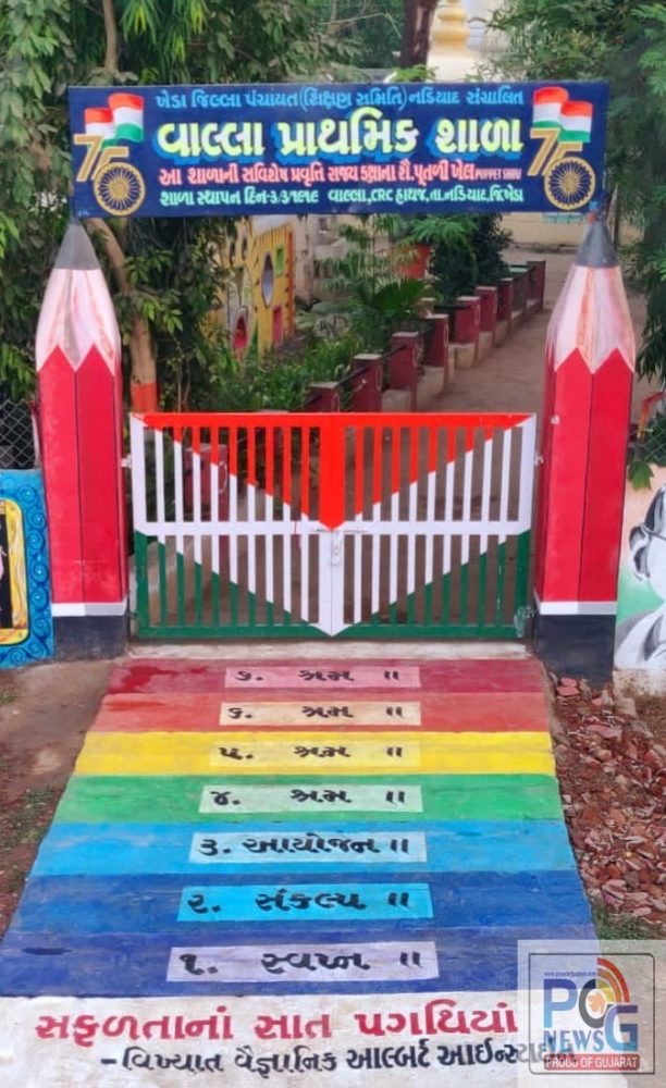 નડિયાદ તાલુકાની વાલ્લાના હિતેશભાઈ બ્રહ્મભટ્ટે આઝાદીના અમૃત મહોત્સવ નિમિત્તે શાળાના આકર્ષક પ્રવેશદ્વારનો નવતર પ્રયોગ કર્યો છે. જે સમગ્ર ખેડા-આણંદમાં સૌ પ્રથમ પ્રયાસ છે પ્રવેશદ્વારે તિરંગો રંગ શોભે છે, સાથે બન્ને બાજુએ ઊભેલી વિશાળ લાલ પેન્સિલ ખૂબ આકર્ષક દેખાય છે. શાળાના સાત પગથિયાં એ જાણો કે. સફળતાના સાત પગથિયાં છે. વિખ્યાત વૈજ્ઞાનિક આલ્બર્ટ આઈન્સ્ટાઈને બતાવેલ સફળતાના સાત પગથિયાં ૧