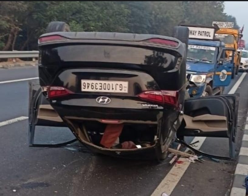 નડિયાદ પાસેથી પસાર થતા અમદાવાદ- વડોદરાના એક્સપ્રેસ હાઇવે પર શુક્રવાર વહેલી સવારના રોજ કારનું એકાએક ટાયર ફાટતા ચાલકે સ્ટેરીંગ પરનો કાબુ ગુમાવ્યો હતો. જેના કારણે આ કાર હાઈવે પર ઊંધી થઈ ગઈ હતી. કારમાં સવાર ચાર વ્યક્તિઓ પૈકી ત્રણ લોકોનો આબાદ બચાવ થયો છે. જ્યારે એક વ્યક્તિ અલ્પેશભાઈ ભીમજીભાઈ દધાણીયાનું ઘટનાસ્થળે મૃત્યુ થયું છે. આકસ્માતની જાણ નડિયાદ રૂરલ પોલીસને થતાં તાત્કાલિક ઘટનાસ્થળે પહોંચી ગઇ હતી. પોલીસે મધુભાઇ હરજીવનભાઇ સરડવાની ફરિયાદના આધારે ગુનો નોંધ્યો છે. મધુભાઈ મોરબી ખાતે રહે છે અને તેઓના મિત્ર ચિરાગભાઇ ચીમનભા બાલ્ટા તથા વિશાલભાઇ હેમંતભાઇ ગોધાણીની વર્ના ગાડી લઇને અમો અમદાવાદના ગોતા ચોકડી ICB ફ્લોર એપાર્ટમેન્ટમાં રહેતા અલ્પેશભાઈ ભીમજીભાઇ ના ઘરે આવેલા અને ત્યાંથી આ તમામ મિત્રો મુંબઈ ધંધા અર્થે ગત ૧૪મી ડીસેમ્બરે નીકળ્યા હતા. જ્યાંથી પરત અમદાવાદ આવતા આકસ્માત સર્જાયો છે. એક્સપ્રેસ હાઇવેના જોશીપુરા સીમ નજીક આ કારનું ડ્રાઇવર સાઇડનું આગળના વ્હીલનું ટાયર ફાટતા કાર આગળ જતા કોઈ ટ્રક સાથે અથડાઈ અને પલ્ટી મારી ગઈ હતી. આ ઘટનામાં વિશાલભાઇ હેમંતભાઇ ગોધાણી, ચિરાગભાઇ ચિમનભાઈ બાલ્ટા તથા અન્ય એકને સામાન્ય ઇજા થયી છે.
