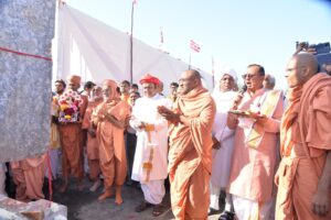 આ પ્રસંગે બાપુ સ્વામી તથા પૂ.નૌતમ સ્વામીએ પ્રાસંગીક ઉદ્‌બોધન કર્યું હતું. દરમ્યાન આચાર્ય શ્રી રાકેશપ્રસાદજી મહારાજે પૂનમ ભરવા આવતા તથા શાકોત્સવમાં પધારેલ ભક્તોને આર્શીવચન પાઠવતા જણાવ્યું હતું કે, ભગવાન શ્રીહરિના સર્વોચ્ચ તીર્થધામ વડતાલ ખાતે રૂા.૩૦૦ કરોડના ખર્ચે તૈયાર થનાર નૂતન અક્ષરભુવનના પ્રથમ સ્તંભ સ્થાપન પ્રસંગે આપ સૌ ભક્તો ઉપસ્થિત રહ્યા છો તે આનંદ અને ગર્વની વાત છે. મહારાજે વડતાલને પોતાનું કેન્દ્ર બનાવ્યું છે. જ્યાં પ્રગટ સ્વરૂપ શ્રીહરિકૃષ્ણ મહારાજ બિરાજે છે. ત્યાં ઉજવાતો કોઈપણ ઉત્સવ સમૈયા જેવો છે. વડતાલ મંદિરને ર૦૦ વર્ષ પૂર્ણ થવાના થોડા મહિનાઓ બાકી રહ્યા છે ત્યારે દ્વિશતાબ્દી મહોત્સવને નિમિત્ત બનાવી જે ઉત્સવો ઉજવાય છે. ભગવાન શ્રી સ્વામિનારાયણે આલોક અને પરલોકના સુખ માટે દેવો પધરાવ્યા છે. પોતાનું શાશ્વત સ્વરૂપ શ્રીહરિકૃષ્ણ મહારાજ પધરાવ્યું છે. તે વડતાલધામમાં જે સેવા કરે છે તેને અવિનાશી સુખ મળે છે. અને પ્રાપ્ત થશે તે વાત નિર્વિવાદ છે. ત્યારબાદ ગોમતીતીરે નૂતન અક્ષરભુવનના પ્રથમ સ્તંભ આરોહણ આચાર્યશ્રી રાકેશપ્રસાદજી મહારાજના હસ્તે કરવામાં આવ્યું હતું.