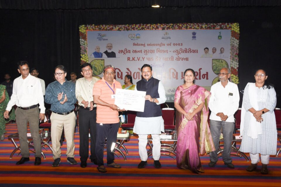 કેન્દ્રીય સંચાર મંત્રી દેવુસિંહ ચૌહાણની અધ્યક્ષતામાં ખેતીવાડી શાખા, ખેડા જિલ્લા પંચાયત કચેરી, નડિયાદ દ્વારા રાષ્ટ્રીય કૃષિ વિકાસ યોજના- ક્રોપ ડાયવર્સિફિકેશન પ્રોગ્રામ તથા એનએફએસએમ ન્યુટ્રી સિરિયલ યોજના અંતર્ગત ઈન્ટરનેશનલ મિલેટ્સ યર ૨૦૨૩ની ઉજવણીના ભાગરૂપે વિવિધ મિલેટ્સ પાકોના વાવેતર અને ઉપયોગને વેગ આપવા ‘કૃષિ મેળો-વ-કૃષિ પ્રદર્શન’ યોજાયો.જેમાં ટ્રેક્ટર, પાક સંગ્રહ સ્ટ્રક્ચર અને વાવણી માટે કુલ રૂ. ૫,૨૯,૨૧૯ની રકમના સહાય હુકમનું વિતરણ કરવામાં આવ્યું તથા ખેડા જિલ્લામાં પ્રાકૃતિક ખેતી કરી સફળતા પ્રાપ્ત કરનારા ખેડૂતોનું સન્માન કરવામાં આવ્યું હતું. મંત્રી દેવુસિંહે કૃષિ મેળાના તમામ સ્ટોલની મુલાકાત લઈ મધમાખી ઉછેર, મિલેટ્સના જીવંત નમૂના અને વિવિધ બિયારણો, પ્રાકૃતિક ખેતી, ઇફ્કો નૈનો યુરિયા, ટ્રેક્ટર કલ્ટી સહાય યોજના અને બાયોકંપોઝ ખાતર વિશે માહીતગાર થઈ જરૂરી માર્ગદર્શન આપ્યું હતું.