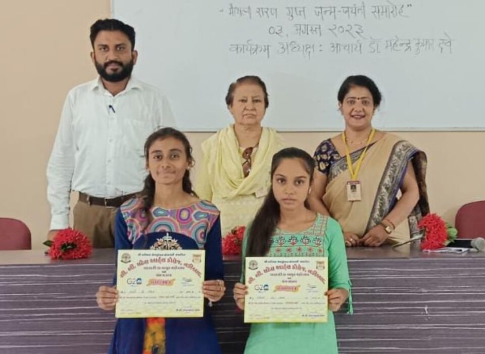 આ સમારોહમાં અધ્યક્ષ તરીકે આચાર્યશ્રી ડૉ. મહેન્દ્રકુમાર દવે સર, હિન્દી વિભાગના અધ્યક્ષ ડૉ.રાની મેડમ, હિન્દી વિભાગના પ્રાધ્યાપક ડૉ.કલ્પનાબેન ભટ્ટ અને ડૉ. ચિરાગભાઈ પરમાર તેમજ મુખ્ય વિષય હિન્દીના વિદ્યાર્થીઓ ઉપસ્થિત રહ્યા હતા. વિદ્યાર્થીઓએ મૈથિલી શરણ ગુપ્તના જીવન – પરિચયની સાથે તેમની રચનાઓની પણ માહિતી આપી હતી. આ સાથે વિદ્યાર્થીઓએ મૈથિલી શરણ ગુપ્તના ‘ સાકેત ‘ ‘ યશોધરા ‘, ‘ વિષ્ણુ પ્રિયા’ જેવા ખંડકાવ્યોના કેટલાક સંદર્ભ પ્રસ્તુત કર્યા હતા. જેમાં શાસ્ત્રોમાં ઉપેક્ષિત નારીઓ જેમ કે ગૌતમ બુદ્ધની પત્ની યશોધરા, લક્ષ્મણની પત્ની ઉર્મિલા તેમજ ચેતન્ય મહાપ્રભુની પત્ની વિષ્ણુપ્રિયાની મહત્તા પર પ્રકાશ પાડવામાં આવ્યો હતો. ગુપ્તજી દ્વારા રચિત રાષ્ટ્રીય કવિતાઓનું પઠન પણ કરવામાં આવ્યું હતું. અને આ રીતે મૈથિલી શરણ ગુપ્તને સ્મરણાંજલિ અર્પી હતી. આચાર્યએ અધ્યક્ષીય પ્રવચનમા રાષ્ટ્ર કવિની મહત્તા પર પ્રકાશ પાડ્યો હતો અને સમગ્ર કાર્યક્રમને બિરદાવ્યો હતો. હિન્દી વિભાગના અધ્યક્ષ ડૉ. રાની મેડમે ગુપ્તજીની ની રચનાઓની મહત્તા કેટલી પ્રાસંગિક છે,તેના પર પ્રકાશ પાડ્યો હતો. હર્ષની વાત છે કે સમગ્ર કાર્યક્રમનું સંચાલન કોલેજમાં સેમ-૫ નો વિદ્યાર્થી વાઘેલા સુનિલે કર્યું હતું.