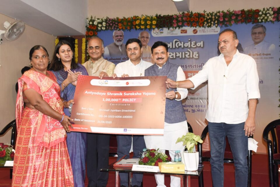ખેડા જિલ્લામાં નડિયાદ આંબેડકર ભવન ખાતે રાજ્યકક્ષા કેન્દ્રીય મંત્રી દેવુસિંહ ચૌહાણના અધ્યક્ષ સ્થાને “અંત્યોદય શ્રમિક સુરક્ષા યોજના”ના પાયલોટ પ્રોજેક્ટ સફળતાની ઉજવણી કરવામાં આવી હતી. અંત્યોદય શ્રમિક સુરક્ષા યોજના જિલ્લાના ૧ લાખ લાભાર્થીઓએ પોલિસી લઈને સમગ્ર ભારતમાં વિક્રમ સાધ્યો છે.