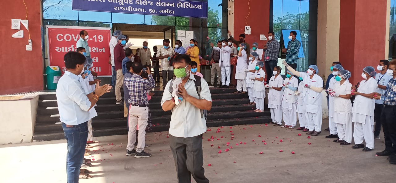 કોરોનાનાં કહેર વચ્ચે હાલ દેશવાસીઓ જીવી રહ્યા છે. કોરોનાનાં કેસો જેટલા વધી રહ્યા છે એની સામે દર્દીઓ સાજા પણ થઈ રહ્યા છે પણ એ રેસિયો ઘણો નીચો છે.કોરોના દર્દીઓને આરોગ્ય વિભાગ દ્વારા અપાતી સારી ટ્રીટમેન્ટનાં પરિણામે નર્મદા જિલ્લાના 11 પૈકી 9 દર્દીઓનો કોરોના રિપોર્ટ નેગેટિવ આવવાથી એમણે 28 મી એપ્રિલે હોસ્પિટલમાંથી રજા આપવામાં આવી હતી.રાજપીપળા આયુર્વેદિક COVID:19 હોસ્પિટલ ખાતેથી 29 એપ્રિલ સવારે 10 વાગ્યે તમામ 9 દર્દીઓને આરોગ્ય વિભાગના વાહનમાં એમના ઘર સુધી પહોંચાડયા હતા.