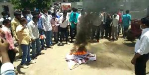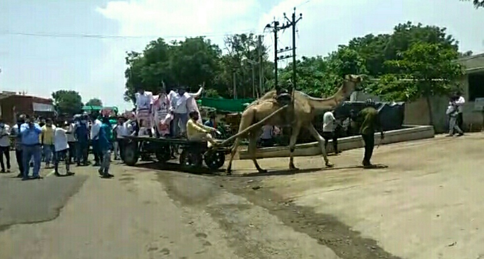 સાથે ગળામાં પ્લે કાર્ડ પહેરી ટ્રેકટર ખેંચી, ઊંટ લારી પર બેસી કોંગી કાર્યકરોએ અનોખી રીતે વિરોધ પ્રદર્શિત કર્યો હતો તથા તાલુકા સેવા સદનનાં ગેટ ઉપર જ પોસ્ટરો પણ સળગાવ્યા હતા.