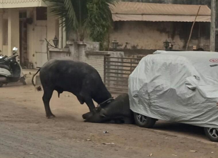 નેત્રંગ ટાઉનમાં બે પાડા વચ્ચે થયેલ મહા યુદ્ધમાં ફોર વ્હીલ ધારકને રૂ.50,000 નું નુકસાન.