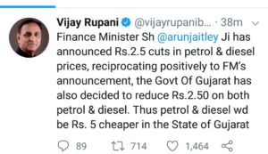કેન્દ્રની ટેકસ ઘટાડવાની અપીલને પગલે ગુજરાતે પણ ટેક્સ ઘટાડયો હતો..જેમાં કેન્દ્ર અને રાજય સરકારના અઢી -અઢી રુપિયાનો ઘટાડો થતા પેટ્રોલ અને ડિઝલમાં 5 રુપિયાનો ઘટાડો થવા પામ્યો છે..