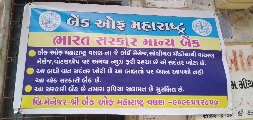 મુંબઇ મહારાષ્ટ્ર માં સહકારી બેંક પી.એમ.સી માં બનેલી ઘટના ના પડઘા વલણ ખાતે આવેલ બેંક ઓફ મહારાષ્ટ્ર માં જોવા મર્યા છે. સામાન્ય લોકો માં ગભરાહતના પગલે બેંક માં પૈસા ઉપાડવા પડાપડી થતા બેંક દ્વારા પોસ્ટરો લગાડી આ રાષ્ટ્રીયકૃત બેંક છે તેમજ તમારી જમા રકમ સલામત છે એમ જણાવવું પડ્યું હતું