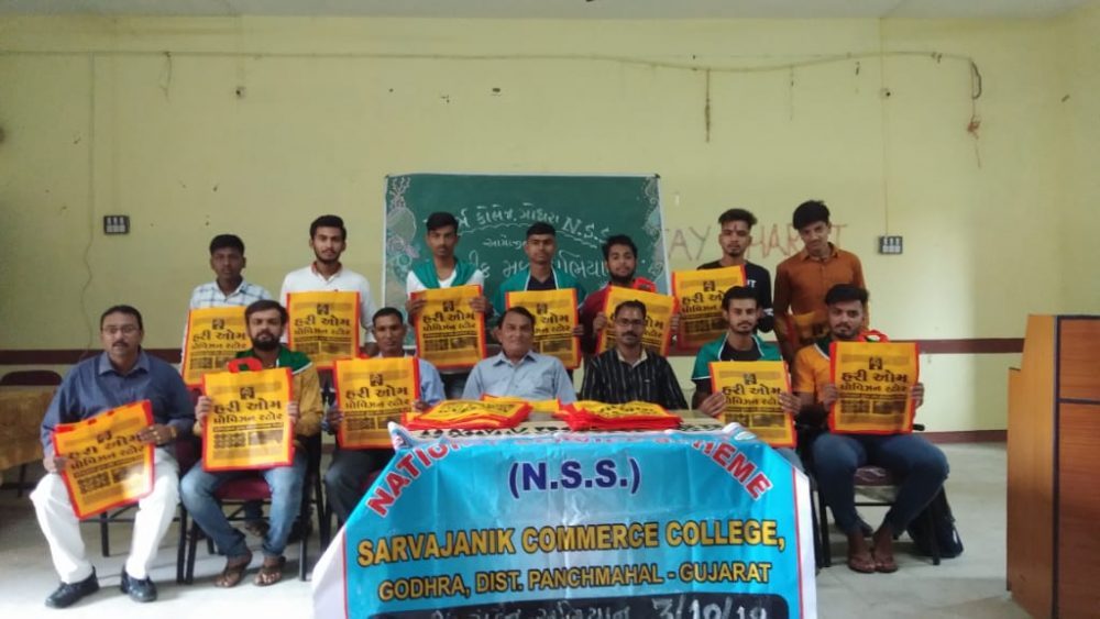 ગોધરા કોમર્સ કોલેજ એન એસ એસ ના વિદ્યાર્થીઓ દ્વારા સિંગલ યુઝ પ્લાસ્ટિકનો બહિષ્કાર કરી પ્લાસ્ટિક મુકત કોલેજ અને યુનિવર્સિટીના નારા હેઠળ ૧૦૦ કાપડની થેલીઓ પીપલોદ નિવાસી ધવલભાઈ એ નાથાણી ના સૌજન્ય દ્વારા વિતરણ કરવામાં આવ્યું હતું અને સિંગલ યુઝ પ્લાસ્ટિકનો સંપૂર્ણ બહિષ્કાર કરવામાં માટે જણાવ્યું હતું આ કાર્યક્રમમાં વિદ્યાર્થીઓ સહિત એન એસ એસ ના પ્રોગ્રામ ઓફિસર અરુણસિંહ સોલંકી ઉપસ્થિત રહ્યા હતા.