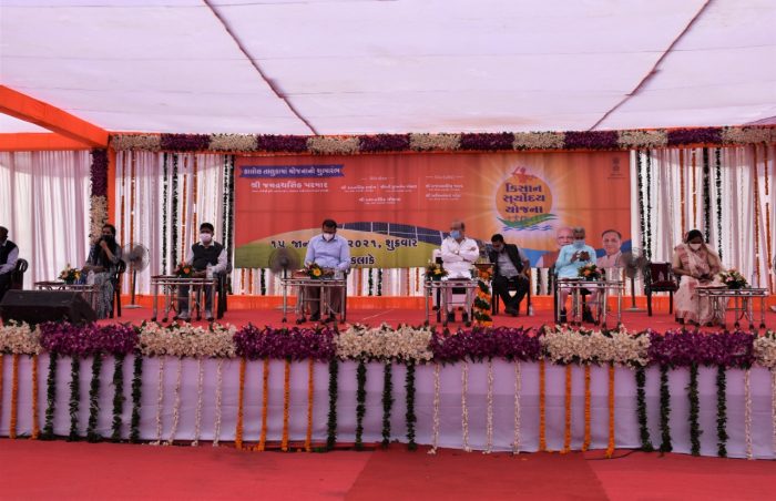 સમગ્ર ગુજરાતમાં ખેડૂતોને પિયત માટે દિવસે વીજપુરવઠો પૂરો પાડવા હાથ ધરાયેલી કિસાન સૂર્યોદય યોજનાના બીજા તબક્કા અંતર્ગત પંચમહાલ જિલ્લાના કાલોલ તાલુકામાં વેજલપુર ખાતે કૃષિ, પંચાયત અને પર્યાવરણ રાજ્યમંત્રી જયદ્રથસિંહ પરમારની અધ્યક્ષતામાં શુભારંભ સમારોહ યોજાયો હતો.