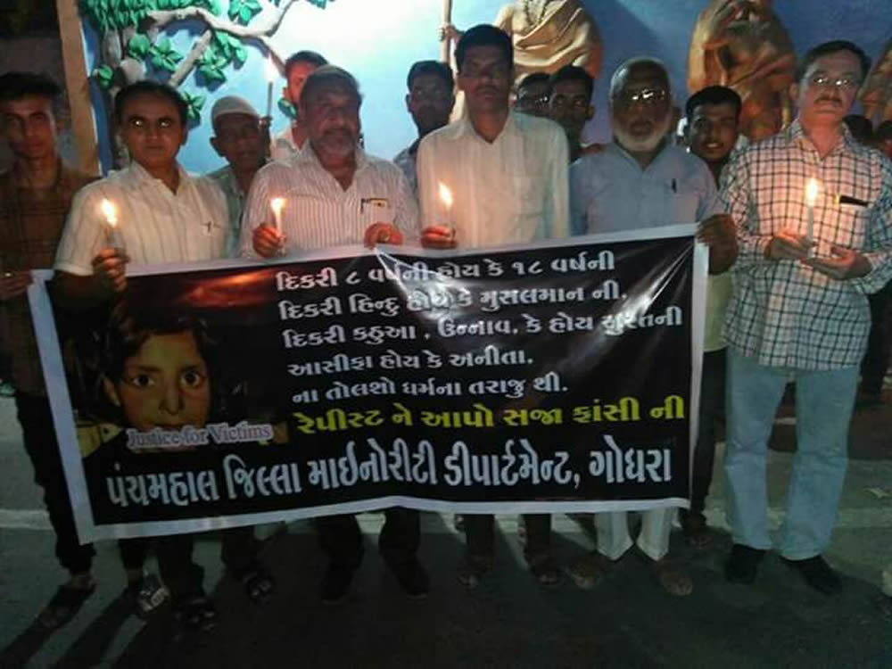 પ્રાપ્ત વિગતો અનૂસાર પંચમહાલના ગોધરા ખાતે સમગ્રદેશમાં ચર્ચાસ્પદ બનેલ આશિફાકેસ,અને સુરતમા દૂષ્કર્મનો ભોગ બનેલ બાળકીના મોત થયા હતા.દેશમાં હાલની બળાત્કારની ઘટનાઓ જેમકે કશ્મીરની કઠુઆ અને UPમાં ઉંનાવ સાથે હાલમા જ ગુજરાતના સુરત શહેરની બાળકી સાથે અને જમ્મુ કશ્મીરમા એક ૮ વર્ષની માસુમ બાળકીપર કરવામા આવેલ દુષ્કર્મ અને તેની હત્યાનો દુ:ખદ બનાવ બનેલ છે તેમા મોતને ભેટેલ આશીફા નામની માસુમ બાળકીની આત્માને શાંતિ મળે તથા હત્યારાઓને યોગ્ય સજા મળે તે માટે પંચમહાલ જિલ્લા કોંગ્રેસ સમિતી (માયનોરિટી વિભાગ )દ્રારા એક એકતા મૌનરેલી કેન્ડલમાર્ચ નું આયોજન કરવામા આવ્યુ હતું. વિશ્વકર્માચોક થી મૌન રેલી સમી સાંજે કાઢવામા આવી હતી.મીણબત્તી પ્રગટાવી બાળાઓના આત્માના શાંતિ માટે પ્રાર્થના કરી હતી.પંચમહાલ જીલ્લા કોંગ્રેસ સમિતિના (માઇનોરીટી વિભાગ)નાં ચેરમેન ઉસ્માનભાઇ બેલી, જિલ્લા પ્રમૂખ અજીતસિંહ ભટ્ટી સહિત કોંગ્રેસનાં અગ્રણીઓ,કાર્યકરો મોટી સંખ્યામાં ઉપસ્થિત રહી મોત પામેલી બાળાઓને શ્રધ્ધાસુમન અર્પણ કર્યા હતા.