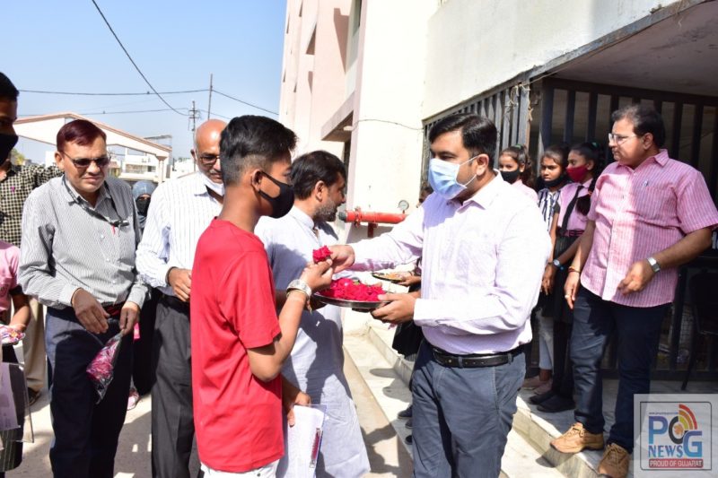પંચમહાલમાં ધો.૧૦ અને ૧૨ નાં વિદ્યાર્થીઓને ગુલાબનું ફૂલ, ગોળઘાણા આપી કેન્દ્રો પર આવકાર.