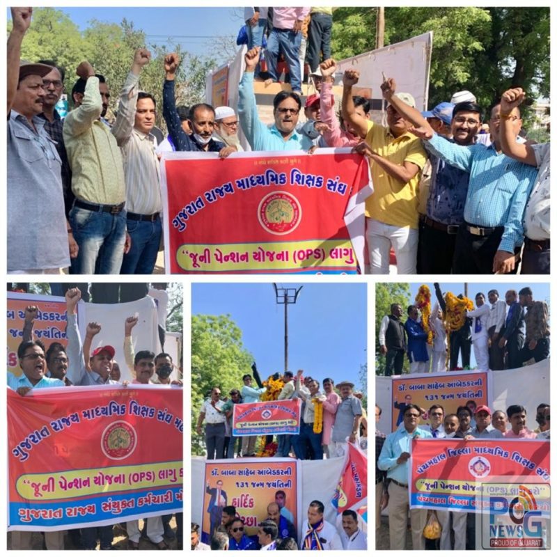 બાબા સાહેબની 131 મી જન્મ જયંતી નિમિતે ગુજરાત રાજ્ય માધ્યમિક શિક્ષણ સંઘ મહા મંડળ અને ગુજરાત રાજ્ય સંયુક્ત કર્મચારી મોરચાના મહા મંત્રી એસ કે પંચોલી એ ડો.બાબા સાહેબ આંબેડરને શ્રદ્ધાંજલિ અર્પી હતી ત્યારબાદ મીડિયાને આપેલ નિવેદનમાં જણાવ્યું હતું કે ગુજરાત સરકાર દ્વારા જે શિક્ષકો અને અન્ય કર્મચારીઓ માં તે જૂની પેન્શન યોજના બંધ કરી જે નવી પેન્શન સ્કીમ અમલમાં મૂકી છે તેનાથી શિક્ષકો તેમજ અન્ય કર્મચારીઓને નુકશાન થઇ રહ્યુ છે તેથી ગુજરાત સરકાર તાત્કાલિક ધોરણે નવી પેન્શન સ્કીમ બંધ કરીને જૂની પેશન સ્કીમ અમલમાં મૂકે તે માટે વિરોધ કરવામાં આવ્યું હતું. ગુજરાત રાજ્ય માધ્યમિક શિક્ષણ સંઘ મહા મંડળ અને ગુજરાત રાજ્ય સંયુક્ત કર્મચારી મોરચા દ્વારા દેશ વિરોધી સરકાર ગુજરાત સરકારનો વિરોધ કરવામા આવ્યો હતો.