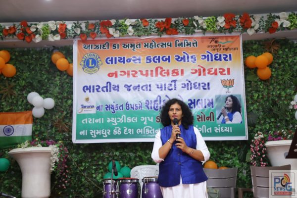 આઝાદીકા અમૃત મહોત્સવ નિમિત્તે લાયન્સ ક્લબ ગોધરા, નગરપાલિકા ગોધરા અને ભાજપ પરિવાર ગોધરા દ્વારા શહીદો કો સલામ એ અંતર્ગત દેશભક્તિના ગીતોની સંગીત સંધ્યાનું આયોજન મોતીબાગ પાર્ટી પ્લોટ ખાતે કરવામાં આવ્યું હતું. શરૂઆતમાં નિરાલી સોની તથા તેમની ટીમ દ્વારા દેશભક્તિના ગીતો સુમધુર સંગીતના સથવારે રજૂ કરવામાં આવ્યા. શહીદોના માનમાં મૌન પાળવામાં આવ્યું હતું. આઝાદીકા અમૃત મહોત્સવ નિમિત્તે લાયન્સ ક્લબના ચેરમેન કેતકી સોનીએ સ્વાગત પ્રવચન કરી સંસ્થાની માહિતી આપી હતી. ગોધરાના શહીદ યુવાન શ્યામ રાજકુમાર યાદવ તથા આર્મીમાં ફરજ બજાવતા સોએબ શેખના પરિવારજનોનું શાલ ઓઢાડી સન્માન કરવામાં આવ્યું હતું. સામાજિક શૈક્ષણિક ક્ષેત્રે અદભુત કામગીરી કરનાર ડોક્ટર શ્યામ સુંદર શર્માનું અભિવાદન કરવામાં આવ્યું હતું. આ પ્રસંગે જિલ્લા પંચાયત પ્રમુખ કામિનીબેન સોલંકી, ધારાસભ્ય સી. કે. રાઉલજી, જિલ્લા કલેકટર સુજલ મયાત્રા, નગરપાલિકા ગોધરાના પ્રમુખ સંજયભાઈ સોની, કોઠી સ્ટીલ વાળા ફિરદોસભાઈ કોઠી, શહેર ભાજપ પ્રમુખ દિલીપભાઈ દસાડીયા, મહામંત્રી હિતેશભાઈ ભટ્ટ, નગરપાલિકાના મનોરંજન સમિતિના ચેરમેન ઉષ્માબેન પટેલ ,નગરપાલિકાના સભ્યો, લાયન્સ ક્લબના સભ્યો તથા નગરજનો ઉપસ્થિત રહ્યા હતા આ કાર્યક્રમને સફળ બનાવવા માટે લાયન્સ ક્લબના હેમંત વર્મા, મહેબૂબ બક્કર, તાહિર ભટુક તથા પ્રદિપ સોનીએ ભારે જહેમત ઉઠાવી હતી.