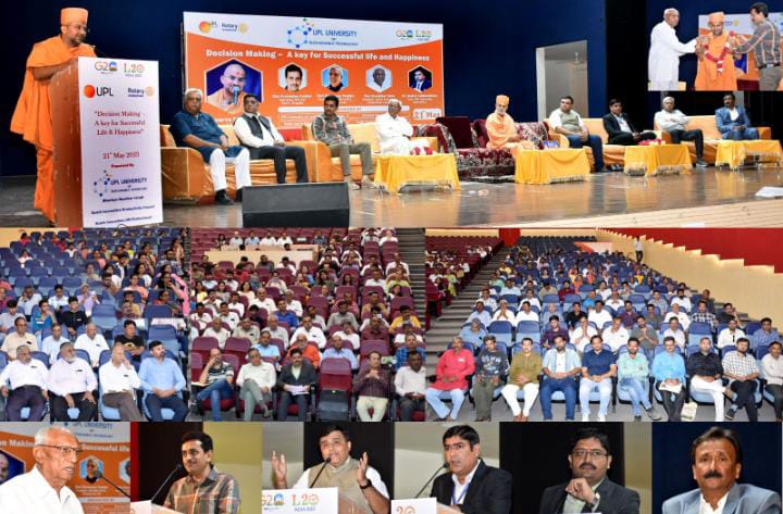 યુપીએલ યુનિવર્સીટી,અંકલેશ્વર, કચ્છ સૌરાષ્ટ્ર એચ.આર.ફોરમ રાજકોટ, કચ્છ સૌરાષ્ટ્ર પ્રોડ્કટીવીટી કાઉન્સિલ રાજકોટ (KSPC), ભારતીય મઝદૂર સંઘના સંયુક્ત ઉપક્રમે ગત તા.૨૧.૦૫.૨૦૨૩ ને રવિવારના રોજ પ્રમુખ સ્વામી ઓડીટોરીયમ,રાજકોટ ખાતે એક ભવ્ય સેમિનાર“નિર્ણય શક્તિ દ્વારા સફળ જીવન અને સુખની ચાવી” વિષય પર યોજાયો હતો. જેમાં મુખ્યત્વે સમગ્ર સૌરાષ્ટ્ર સહિત ગુજરાતભરની પ્રખ્યાત કંપનીઓના એચ.આર.પ્રોફેશનલ્સ, સર્વિસ પ્રોવાઇડરો તેમજ વિદ્યાર્થીઓ બહોળી સંખ્યામાં ઉપસ્થિત રહ્યા હતા. કાર્યક્રમમાં આશીર્વચન અને આધ્યાત્મિક વિચારોના આદાન-પ્રદાન માટે BAPSના શ્રી પ્રખર અભ્યાસુ સંતશ્રી અપૂર્વમુની સ્વામીશ્રી, સ્વામી નારાયણ મંદિર, કાલાવડ રોડ, રાજકોટ ઉપરાંત મુખ્ય વક્તા તરીકે શ્રી પ્રવિણદાન ગઢવી, યુનિટ હેડ,યુપીએલ લીમીટેડ, વિષય અનુરૂપ ટીપ્પણીઓ માટે શ્રી હસુભાઈ દવે, પ્રમુખશ્રી કચ્છ સૌરાષ્ટ્ર પ્રોડ્કટીવીટી કાઉન્સિલ રાજકોટ (KSPC), ડૉ.સ્નેહલ લોખંડવાલા, ડીનશ્રી, યુપીએલ યુનિવર્સીટી,અંકલેશ્વર દ્વારા ખાસ ઉપસ્થિત રહી સર્વેને માર્ગદર્શન આપવામાં આવ્યું હતું. મુખ્ય આયોજકો દિલીપભાઈ પંચમીયા, સેક્રેટરી,કચ્છ સૌરાષ્ટ્ર પ્રોડ્કટીવીટી કાઉન્સિલ રાજકોટ (KSPC), ડૉ.રાજુભાઈ દવે વિભાગીય વડા, સમાજકાર્ય ભવન, રાજેન્દ્રભાઈ ગઢવી, ડીપાર્ટમેન્ટ હેડ-રાજકોટ નાગરિક બેંક, સહદેવસિંહ જાડેજા, પ્રમુખ,ભારતીય મઝદૂર સંઘ, ગુજરાત પ્રદેશ,તથા ધર્મેશભાઈ પટેલ, રજીષ્ટ્રાર, યુપીએલ યુનિવર્સીટી, અંકલેશ્વર વગેરે તરફથી સર્વે ઉપસ્થિત લોકોનું ઉષ્માભર્યું સ્વાગત કરવામાં આવ્યું હતું. કાર્યક્રમમાં નરેન્દ્રભાઈ દવે, વિજયભાઇ રાબડિયા, RNSB ના અગ્રણીઓ સર્વે કિશોરભાઇ મુંગલપરા, ધોળકિયાસાહેબ, ગીતાંજલી કોલેજના શૈલેષભાઈ જાની, ભારતીય મજદૂર સંઘના સહ પ્રભારી, વાલજીભાઇ ચાવડા સહિત અનેક અગ્રણીઓ ઉપસ્થિત રહ્યા હતા.