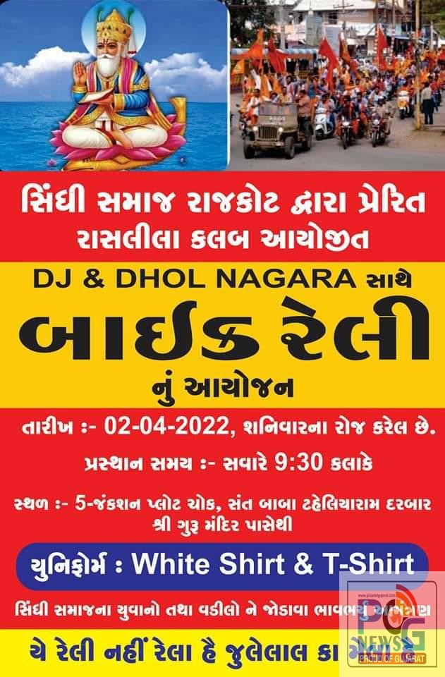 રાજકોટમાં સિંધી સમાજ અને રાસલીલા કલબ દ્વારા ચેટીચાંદ મહોત્સવ નિમિત્તે તારીખ 2/4/2022 ને શનિવારે સવારે 9:30 કલાકે જંકશન પ્લોટ સંત બાબા ટહેલીયા રામ દરબાર સાહેબ શ્રી ગુરુ મંદિર ખાતેથી ડીજે અને ઢોલ-નગારા સાથે ભવ્ય બાઇક રેલીનું આયોજન કરવામાં આવ્યું છે જેમાં સિંધી સમાજના યુવાનો તથા વડીલોને જોડાવા માટે રાજકોટ સિંધી સમાજ દ્વારા અનુરોધ કરવામાં આવ્યો છે.