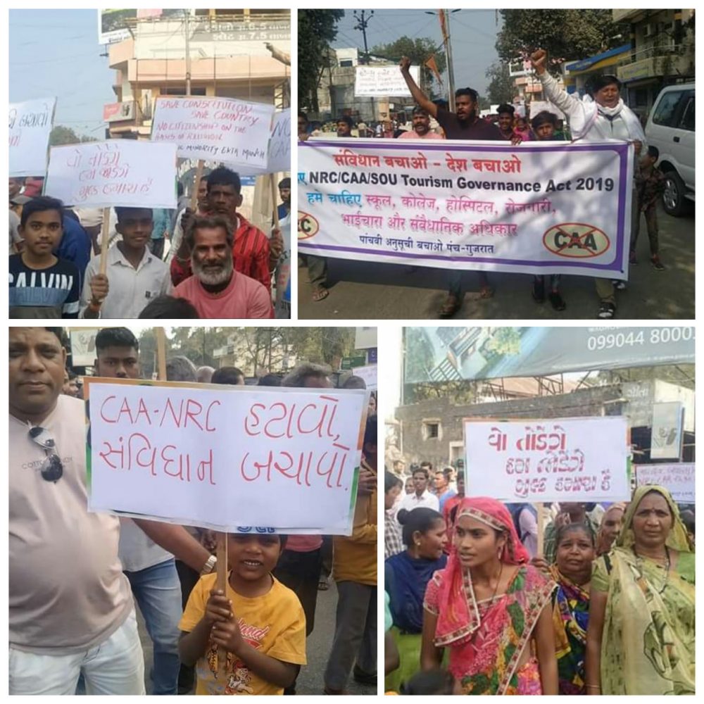 રાજપીપલા નર્મદા જિલ્લાના સ્થાનિક આદિવાસી આગેવાનો અને આદિવાસી સંગઠનો તેમજ મુસ્લિમ સંગઠનના અગ્રણીઓ સહિત ના લોકો ભેગા થઇ ને રાજપીપલામાં NRC, CAA અને સ્ટેચ્યુ ઓફ યુનિટી પ્રવાસન સત્તા મંડળના કાયદા નો વિરોધ કરી રાજપીપળાના જાહેર માર્ગ પર રેલી કાઢીને ડૉ.બાબાસાહેબ આબેડકર ની પ્રતિમાને ફુલહાર કરવામાં આવ્યા હતા બાદમાં આગળના નિયત રૂટ પર રેલી પ્લેકાડૅ, બેનરો સાથે સરકાર સરકાર વિરોધી સુત્રોચાર કરીને કલેકટર કચેરી ખાતે પોહચી હતી જયાં મોટી સંખ્યામાં રેલીમાં જોડાયેલા આદિવાસી સમુદાય ના લોકોની ઉપસ્થિતિમાં દેશના રાષ્ટ્ર પતિ, વડા પ્રધાન, કેન્દ્રીય ગૃહ મંત્રી, રાજ્યપાલ,મુખ્ય મંત્રી સહીત સંબંધિત અધિકરીઓ અને મંત્રીને સંબોધતું આવેદન આપ્યું હતું। જેમાં કારોબારી ચેરમેન બહાદુર વસાવા, પાલિકા પૂર્વ પ્રમુખ ભરત વસાવા, ડો.શાંતિકર વસાવા, ડો.પ્રફુલ વસાવા, શકીલ શેખ, સહીત ના આગેવાનો જોડાયા હતા અને સરકારે દેશમાં લાગુ પડાયેલા કાયદાઓનો ભારે વિરોધ નોધાવી સંવિધાન બચાવો દેશ બચાવોCCA NRRC નો ઠોકી બેસાડેલો કાળો કાયદો રદ કરો રદ કરોના નારા લગાવવામાં આવ્યા હતા. જેમનું કહેવું છે કે આ કાયદો એકદમ ભારતીય સંવિધાન અનુચ્છેદ 244 (1) હેઠળની 5 અનુસૂચિ 1 મા આદિવાસીઓ ને આપવામાં આવેલા અધિકાર ના પ્રાવધાનોનો ભંગ થઈ રહ્યો છે અને આ કાયદાઓથી દેશના મુળ માલિક ગણાતા આદિવાસીઓને આપવામાં આવેલા બંધારણીય અધિકારો હકકો ઉપર તરાપ વાગીને છીનવાઈ જાય તેમ છે આદિવાસી વિસ્તાર અને અનુસૂચિત 5 ના આદિજાતિ વિસ્તારોમાં જનજાતી ના વિકાસ માટેની ખાસ જોવાઈ અને સસ્વંત્રતા સત્તા આપવામાં આવી છે. પેસા એક્ટ રાજ્યમાં લાગુ છે. ત્યારે NRC, CAA કાયદો કોઈ પણ રીતે લાગુ પાડી શકાય નહિ આદિવાસી વિસ્તારમાં સ્વતંત્રતા જરૂરી છે. જેથી આ કાયદાનો વિરોધ કરીએ છે જેને રદ કરો આ સાથે સ્ટેચ્યુ ઓફ યુનિટી પ્રવાસન સત્તા મંડળ ના કાયદા નો વિરોધ સ્થાનિક લોકોને નુકસાન પહોંચાડશે અને આદિવાસીઓને બેઘર કરી દેશે આ માટે આ કાયદાને રદ કરો એવી માંગણી કરી છે. આ સાથે સરકાર આવા નિયમો કાયદાઓ હેઠળ આદિવાસીઓનો સ્વતંત્રતાના અધિકારો છીનવી અવાજ દબાવી દેવા માંગે છે અને જમીનો હડપી લેવા માંગે છે જેને કારણે આજે ભારે ઉગ્ર વિરોધ કરવા આદિવાસીઓએ જાહેર માગૅ પર નિકળી ને વિરોધ કરવામાં આવી રહ્યો છે. આ બાબતે નમૅદા જિલ્લા પંચાયત ના કારોબારી ના ચેરમેન બહાદુર વસાવાએ જણાવ્યું હતું કે સરકાર આદિવાસીઓના વિસ્તારમાં આવા કાયદા ઓ ઠોકી બેસાડી આદિવાસીઓના બંધારણના અધિકારો હકકો છીનવવાનુ કામ કરી રહી છે જેનો અમે કોઈ પણ સંજોગોમાં ચલાવી લઈ નહિ લઈ જેનો અમે ભારે ઉગ્રભયૉ વિરોધ કરવામા આવશે અને જરૂર પડશે તો હાઈકોર્ટે સુપ્રીમ કોર્ટમાં સરકાર ના ઠોકી બેસાડેલા કાયદાઓને રદ કરવા જાહેર પીટીશન પણ દાખલ કરવામા આવશે