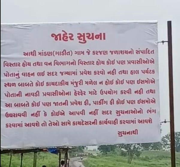 આ તમામની વચ્ચે માંડણ ગામમાં પ્રવાસીઓએ પ્રવેશવું નહિ એવું બોર્ડ મારી દેતા પ્રવાસીઓમાં ભારે નારાજગી છવાઈ છે. એ બોર્ડમાં જણાવ્યા મુજબ માંડણ (ગાડીત) ગામ કરજણ જળાશયનો સંપાદિત વિસ્તાર છે અને વન વિભાગનો વિસ્તાર છે. જેથી પ્રવાસીઓએ પોતાનું વાહન આ ગામમાં લઈ આવવું નહિ. પર્યટક સ્થળ બાબતે કોઈ કાયદાકિય મંજૂરી મળી નથી જેથી કોઈ પણ વ્યક્તિએ પોતાની નાવડી પ્રવાસીઓના હેરફેર માટે ઉપયોગ કરવી નહિ તથા કોઈ પણ પ્રવાસી પાસે આ બાબતે ફી લેવી નહિ સાથે સાથે પાર્કિંગ ફી પણ કોઈએ ઉઘરાવવી નહિ. આ સૂચનાઓનો ભંગ કરનાર વિરુદ્ધ કાયદેસરની કાર્યવાહી કરવામાં આવશે. આ બોર્ડ બાદ માંડણ ગામના યુવાનોની રોજગારી અને પ્રવાસીઓના આગમન પર સંકટ ઉભું થયું છે. બીજી તરફ રાજકીય લોકો પણ રોષે ભરાયા છે.